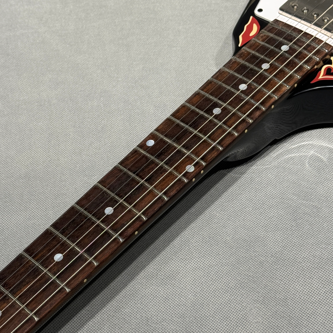 元々はサンバースト仕上げだったこのギターについて、エボニーへのリフィニッシュ後、