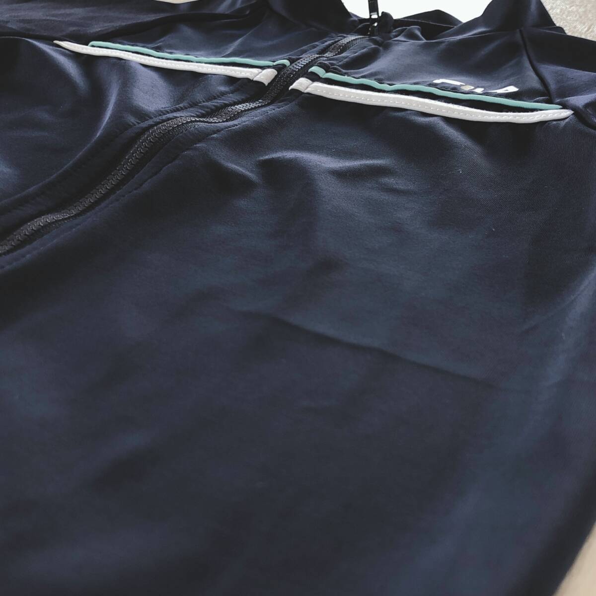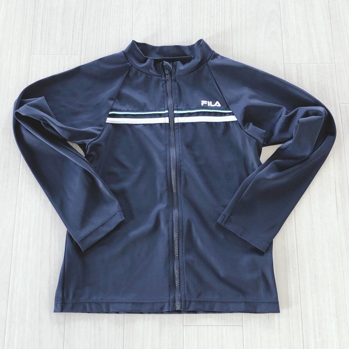 Y1340 美品 FILA フィラ キッズ トップス ジャンパー 長袖 伸縮性 薄手 水着 140 ネイビー 紺 ロゴプリント シンプル スポーティ 夏