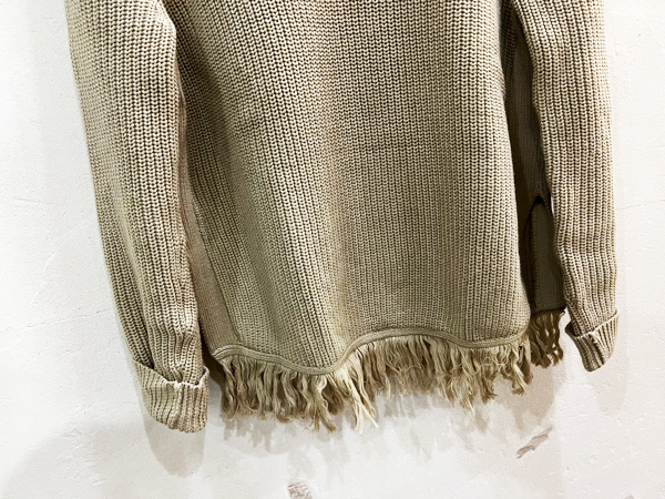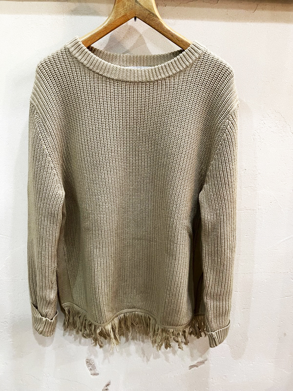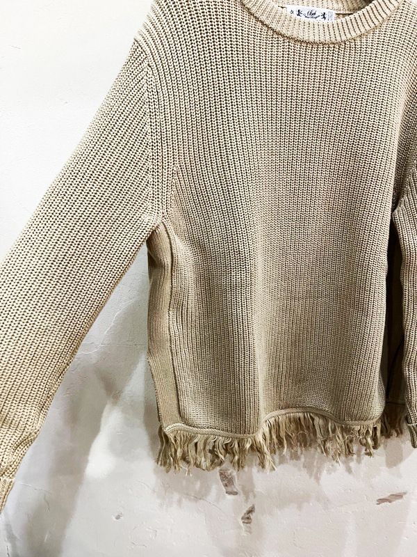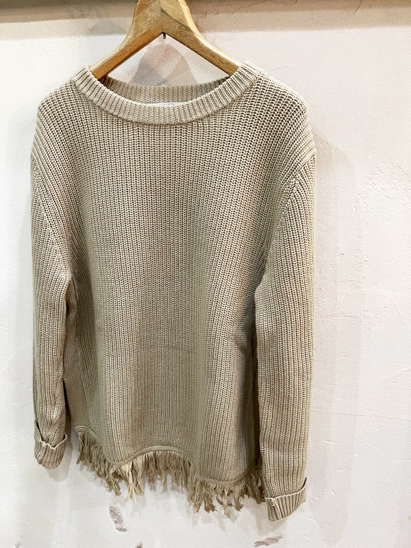 脇部分切替になったベーシックなニット。裾のフリンジがワンポイントになっています。