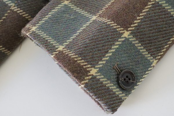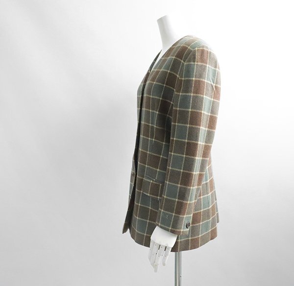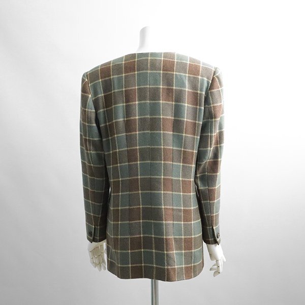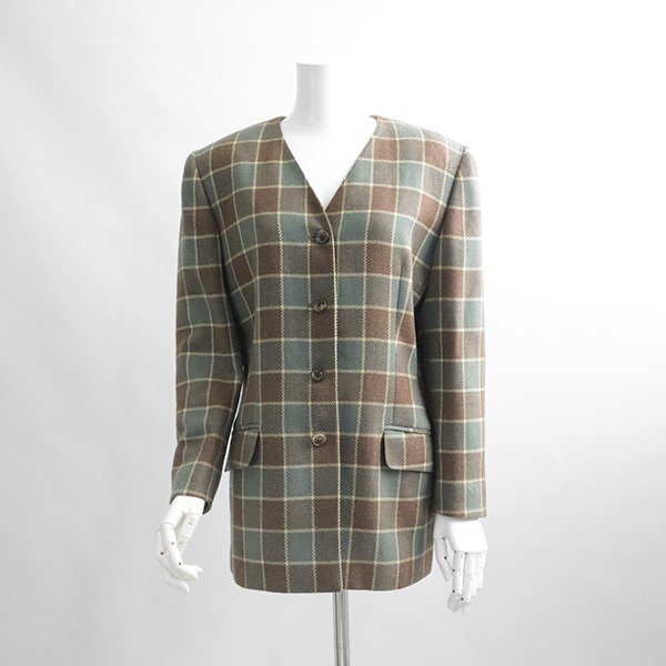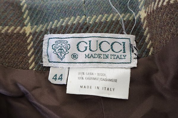 ● オールド GUCCI ◆ ノーカラー ジャケット ブラウン系 サイズ44 カシミヤ混 チェック Vネック 伊製 ヴィンテージ グッチ ◆ZX12