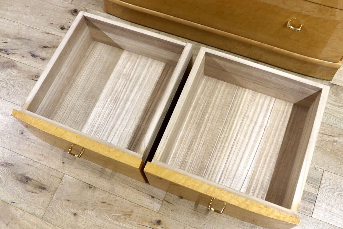 バーズアイメープルはハードメープルの中にごく稀に発生するもので、表面近くの1/5のみでしかとれない大変貴重な材で、丸い玉のような模様が連なったり、渦巻状になって現われる杢目で、鳥の目に似た模様が集まっているところから“鳥目杢”(とりめもく)と呼ばれています。神秘的な木目と衝撃に強く割れにくい性質から高級家具や高級車の内装材として使用されています。