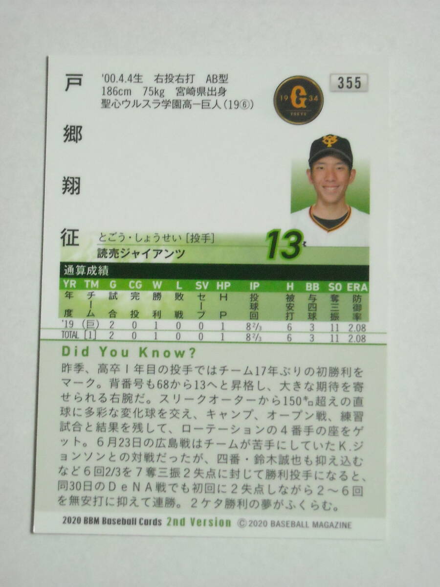 戸郷翔征 #355 BBM 2020 読売ジャイアンツ 宮崎県都城市 聖心ウルスラ学園高等学校卒 通算防御率2.75 789イニング