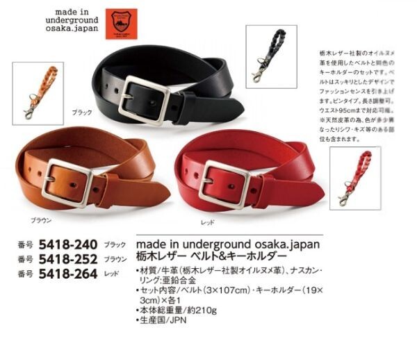 | 【商品番号】 5418-240 / 5418-252 / 5418-264 【商 品 名】 made in underground osaka.japan 栃木レザー ベルト &キーホルダー 1本 |