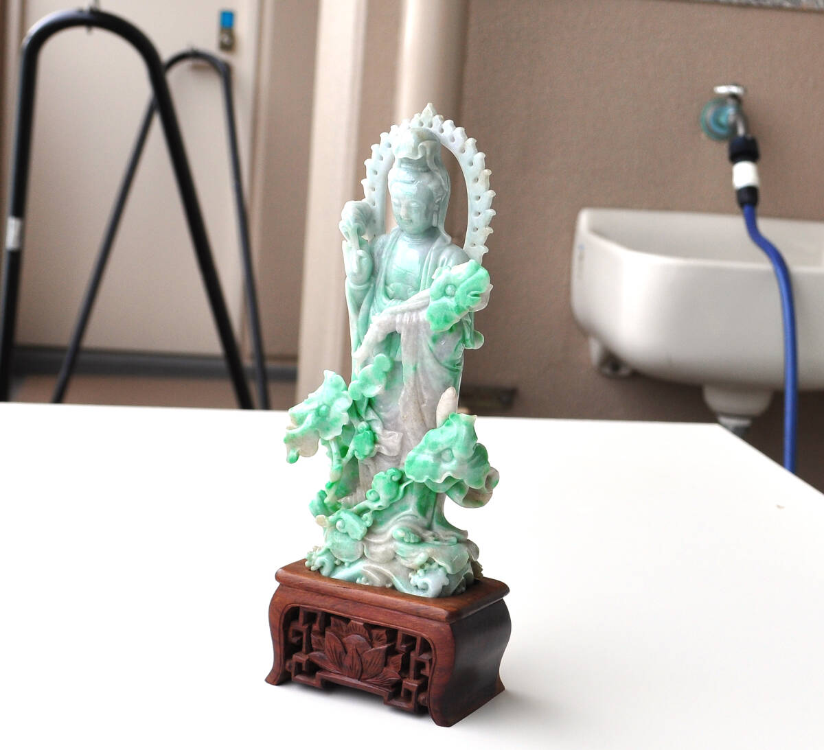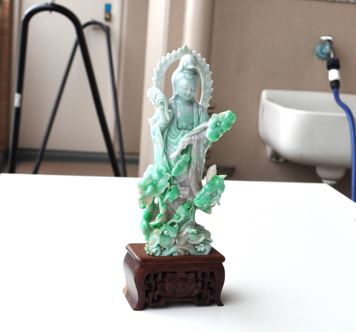 ※本商品は非常に高品質な糸魚川翡翠の原石を用いて作った非常に神々しい観音様の置物になります。