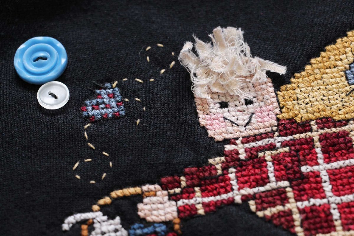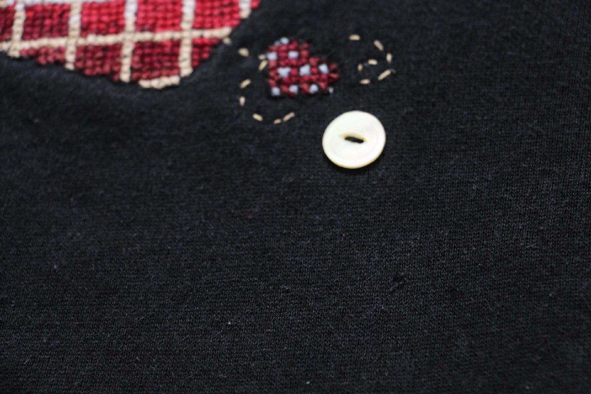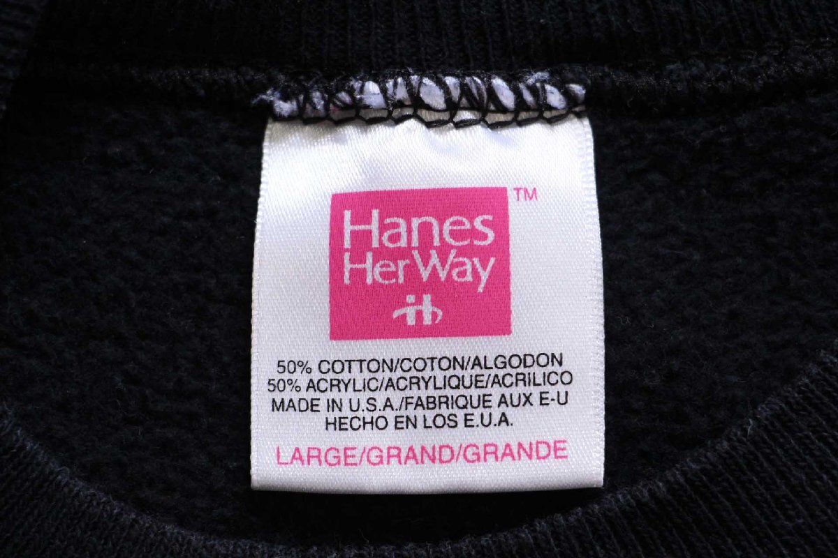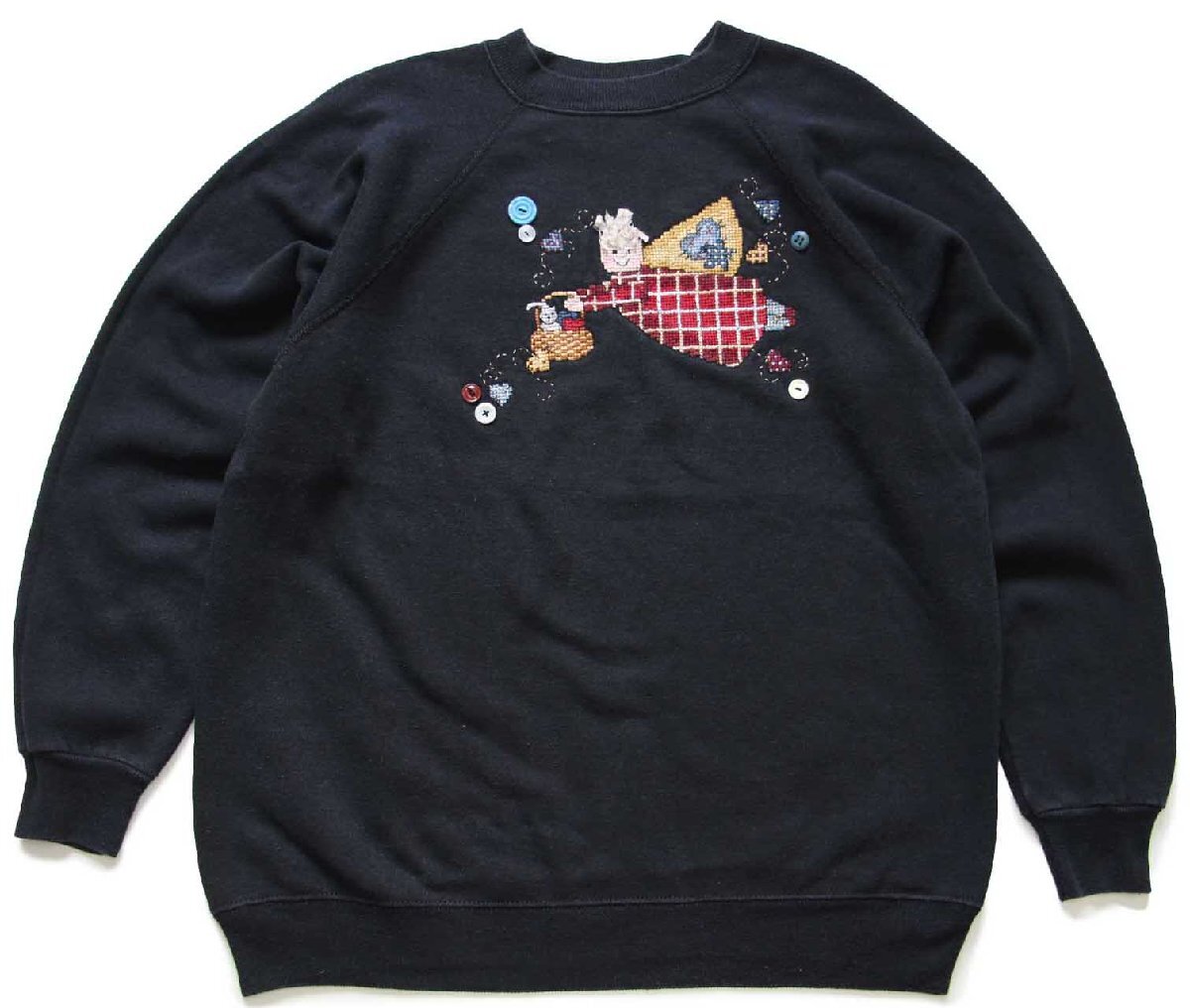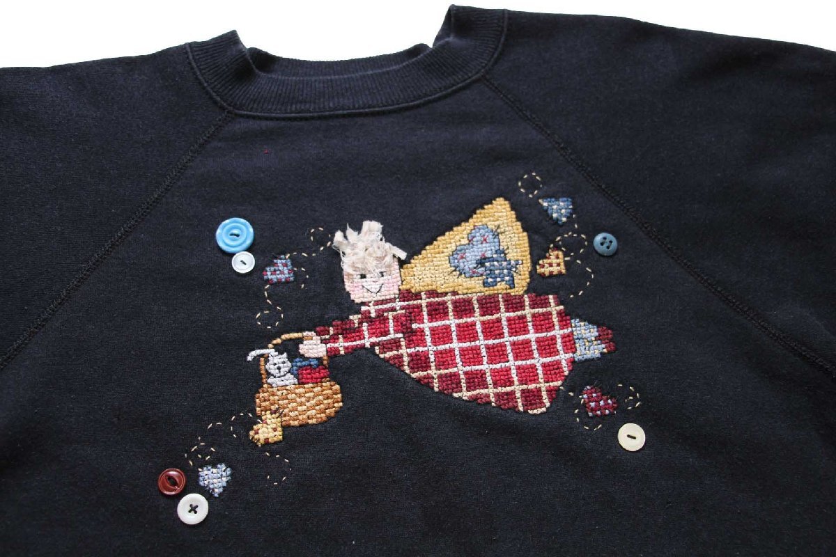 ★90s USA製 Hanes Her Way ハンド刺繍&ボタン装飾 スウェット ブラック L★オールド ビンテージ 妖精 ネコ ラグランスリーブ リメイク