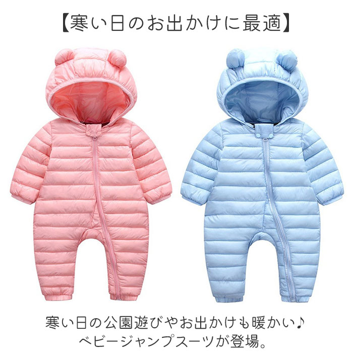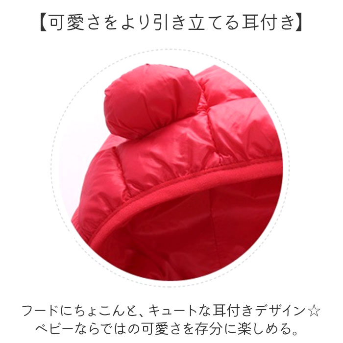| 商品説明 | ・・【寒い日のお出かけに最適】 ・寒い日の公園遊びやお出かけも暖かい♪ベビー ジャンプスーツが登場。 ・【防寒できる中綿入り】 ・中綿入りであったか♪寒い季節のアウターとして、防寒対策にぴったり。 ・【顔周りもしっかり防寒】 ・フード付きなので顔周りもしっかり冷気や風から守ってくれるのもGOOD。 ・【可愛さをより引き立てる耳付き】 ・フードにちょこんと、キュートな耳付きデザイン☆ベビーならではの可愛さを存分に楽しめる。 ・【シンプルなワンカラーデザイン】 ・ファスナーの色も生地と統一したワンカラー仕様。無地デザインでシンプルなおしゃれさを追求。 ・【着脱がスムーズ】 ・襟元から足首までのファスナーを搭載。ガバッと大きく開くからお着替えやおむつ替えもスムーズに! ・【動きやすい軽さ】 ・大好きな外遊びも邪魔しない軽さも嬉しいポイント。赤ちゃんでも負担にならない軽量素材。 ・【ギフトにもオススメのアイテム】 ・出産祝いやお誕生日のギフトにも喜ばれる!みんなに好印象のシンプルデザインがGOOD! |