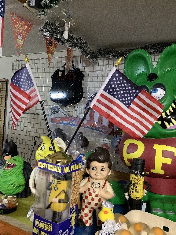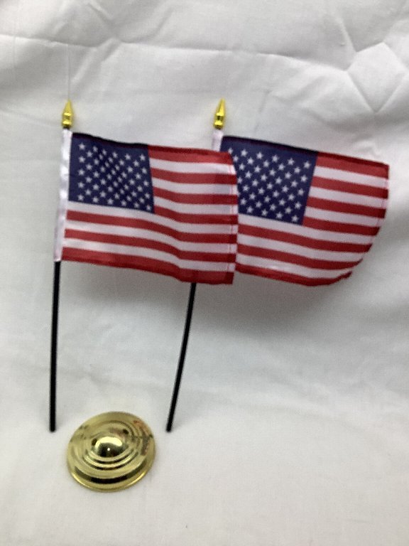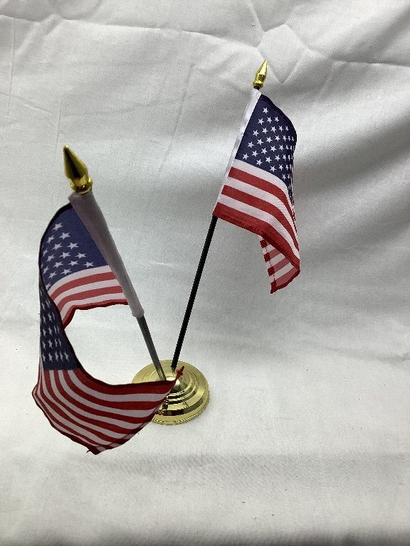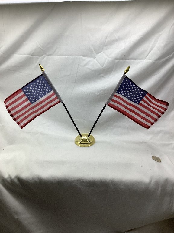 【209072】定番の卓上フラッグです。 デスクの上にこれまた丁度いいサイズです。 素材:ポリエステル アメリカ星条旗サイズ:H:10.2cm W:15.2cm プラスティックサイズ:26.7cm ホルダーサイズ:φ6.7cm