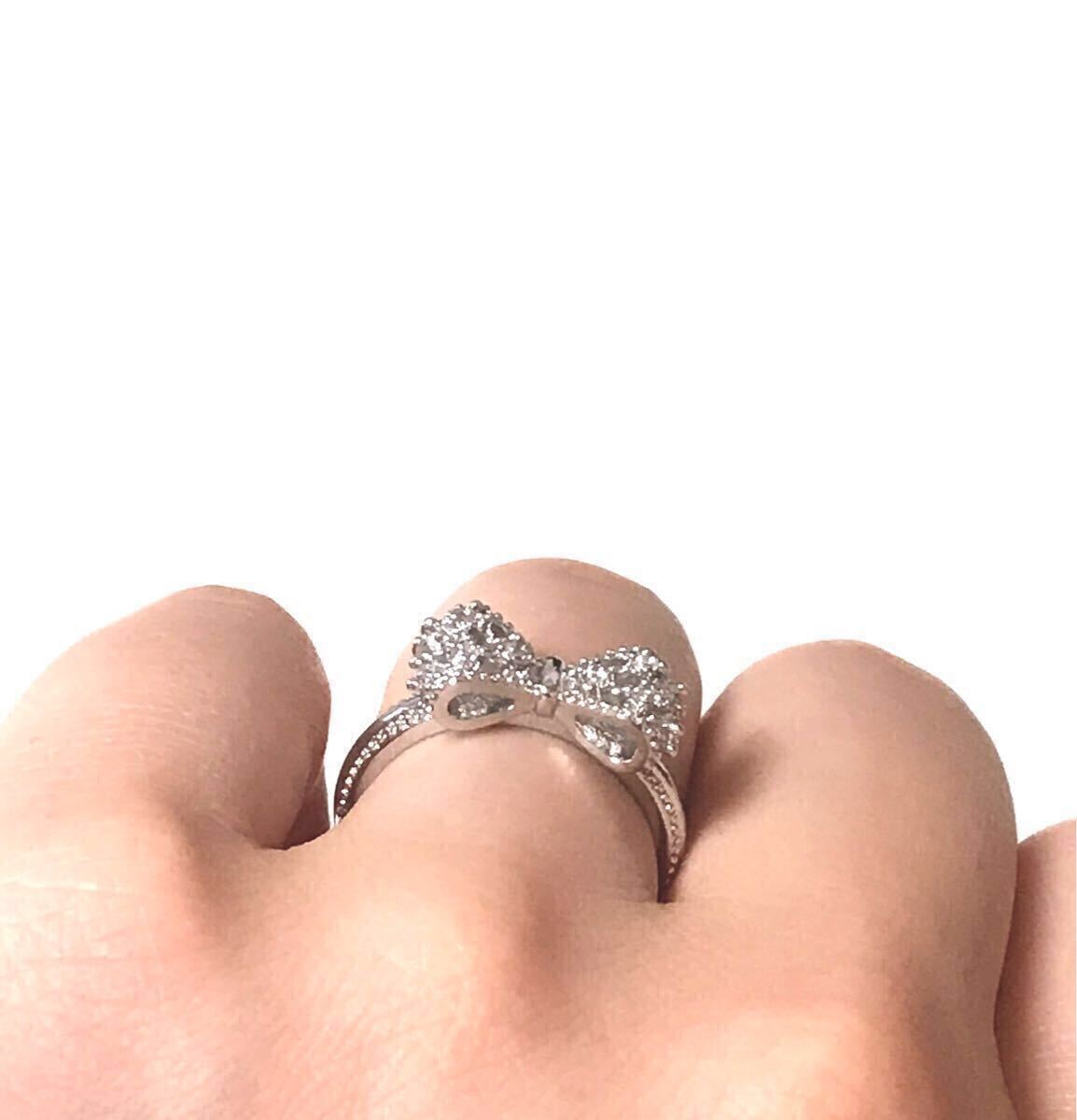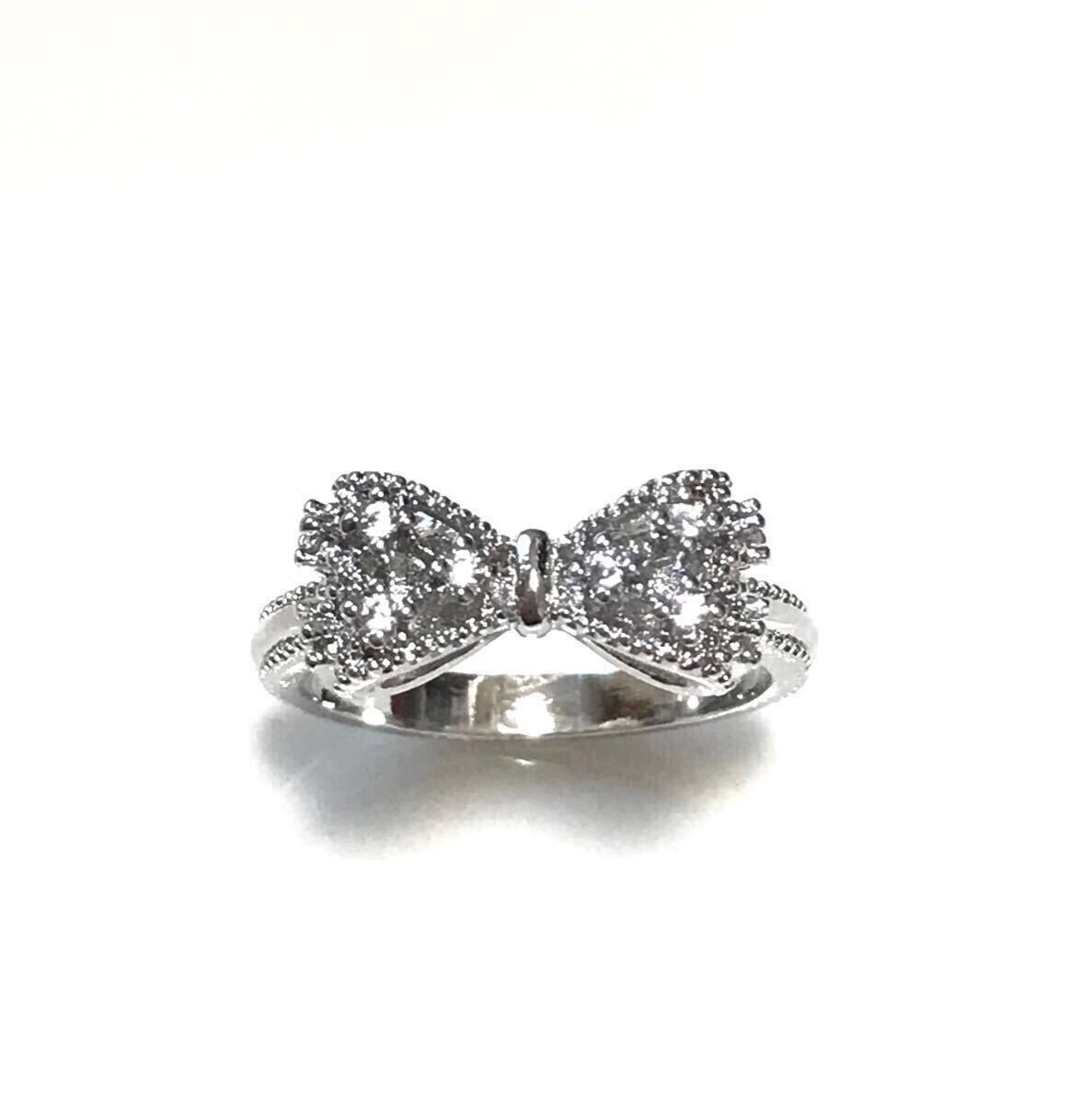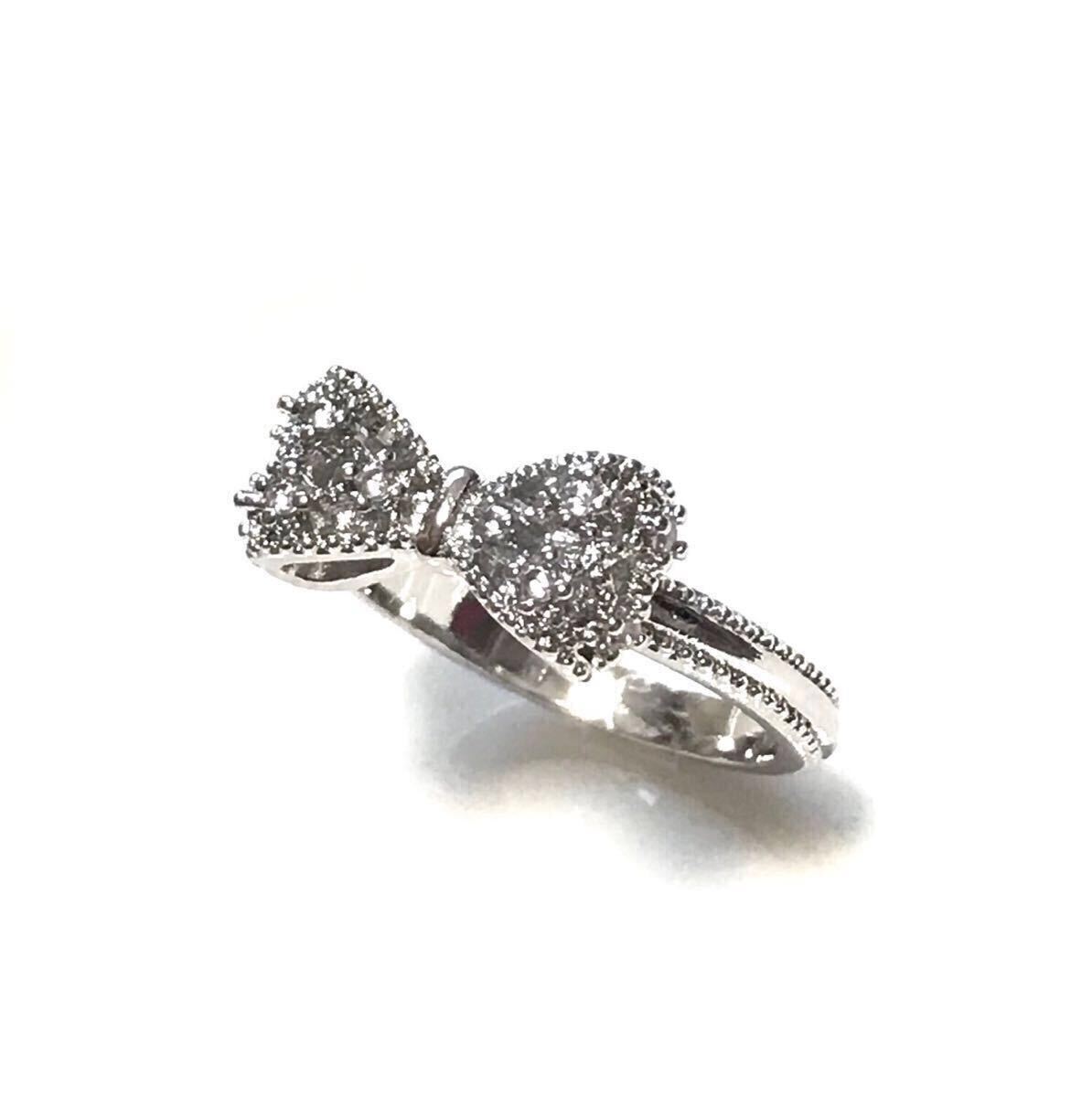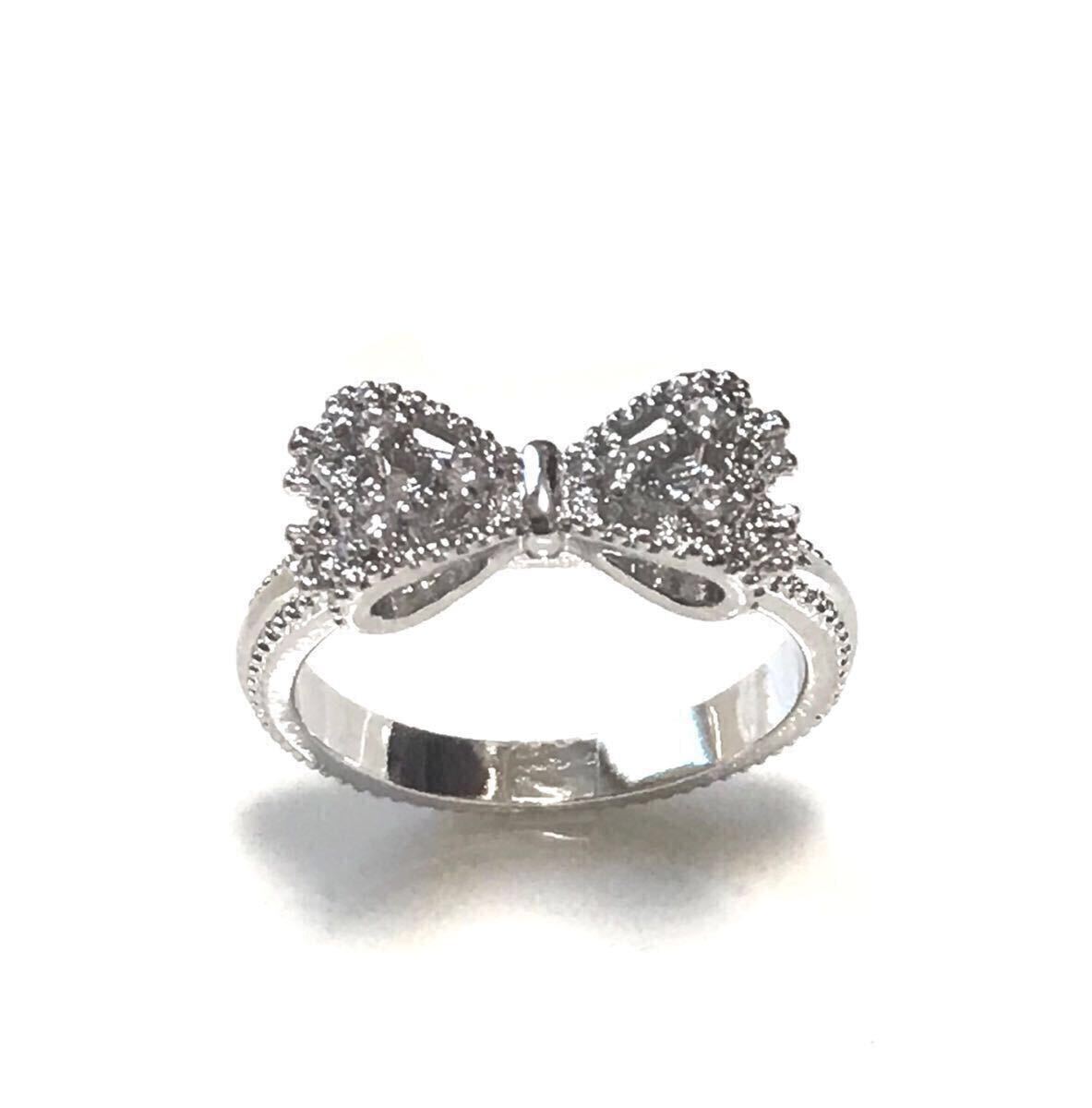 立体的なリボンのデザインと、そこに埋め込まれたAAACZリングの輝きが可愛らしい、フェミニンなデザインのリングです。どんなファッションにも良く合うお品です。