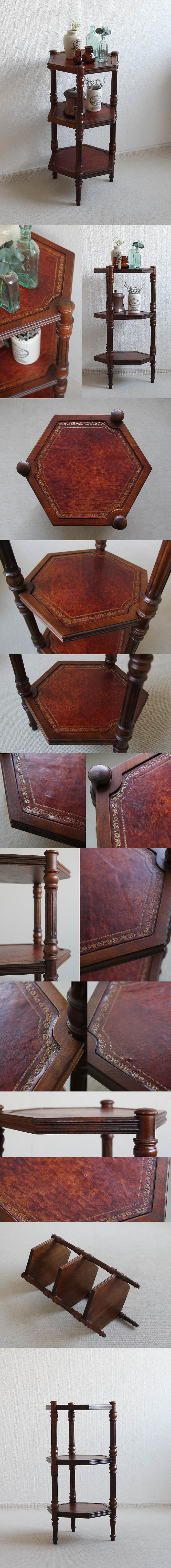 イギリスから直輸入したアンティー ク調家具レザートップの飾り台3段/サイドテーブル。