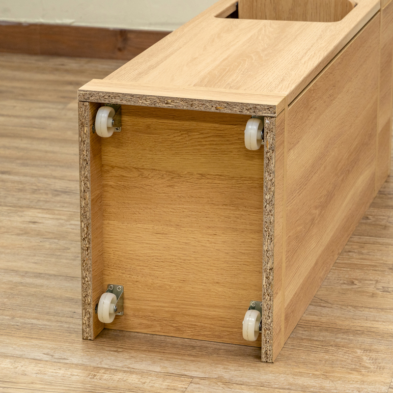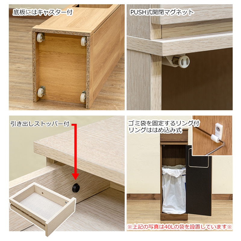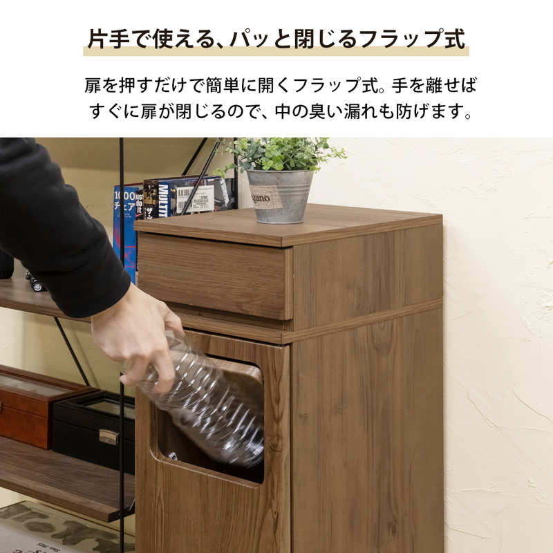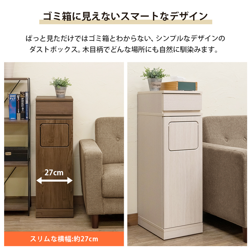 | 材質 | 組立品(約50分) ゴミ箱には見えない、お部屋に自然に溶け込む木目調のダストボックス。 蓋がサッと締まるので臭いが漏れにくいフラップ式になっています! スリムで省スペース。パッと見たらゴミ箱には見えない、無駄を省いた木目柄のダストボックスです。 パタンと閉じるフラップ式で、内部の臭いも漏れにくくなっています。 少し大きいペットボトルなどは扉を空けて直接中の袋へ、マグネット式でスムーズに開け閉めできます。 上部には引き出しが1杯付属、交換用のごみ袋などの収納にも役立ちます。 また本体底面にはキャスターが付いており、どこにでも設置したい場所へ気軽に移動できます。 |