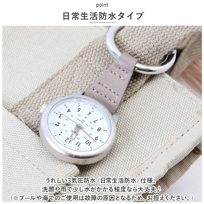 商品説明 | ・・アクセサリー間隔で持ち歩ける♪Plaisir(プレジール)カラビナウォッチが新登場。 ・【簡単装着できるカラビナ式】 ・バッグやベルトループに取り付けできるカラビナウォッチ。逆さまにぶら下げても、そのまま時刻を確認できるつくり。職業柄、腕に身に着けられない時などにも便利なアイテム。 ・【日常生活防水タイプ】 ・うれしい3気圧防水(日常生活防水)仕様。洗顔や雨で少し水がかかる程度なら大丈夫♪(※プールや海でのご使用は故障の原因となるため、お控えください。) ・【暗いところでも安心】 ・紫外線に反応して光を蓄え、発光する蓄光仕様。暗闇でも時刻を確認することができて、使い勝手ばっちり。 ・【知育時計としても】 ・文字盤には様々な数字が書かれており、「10時は22時。10時の方向は50分」など、時計の読み方が自然と身につく♪お子さまのトレーニングにもおすすめ! ・【ナチュラルな仕上がり】 ・艶を消したシルバーケースに、ニュアンスカラーのベルトをプラス。年代問わず持ちやすいデザインが魅力。お好みのカラーをチョイスして♪ |