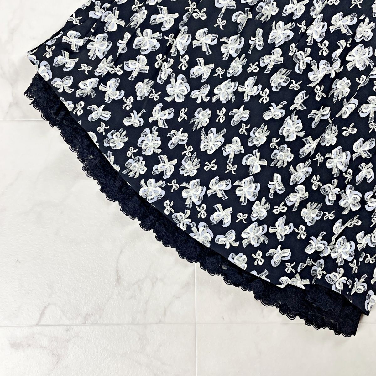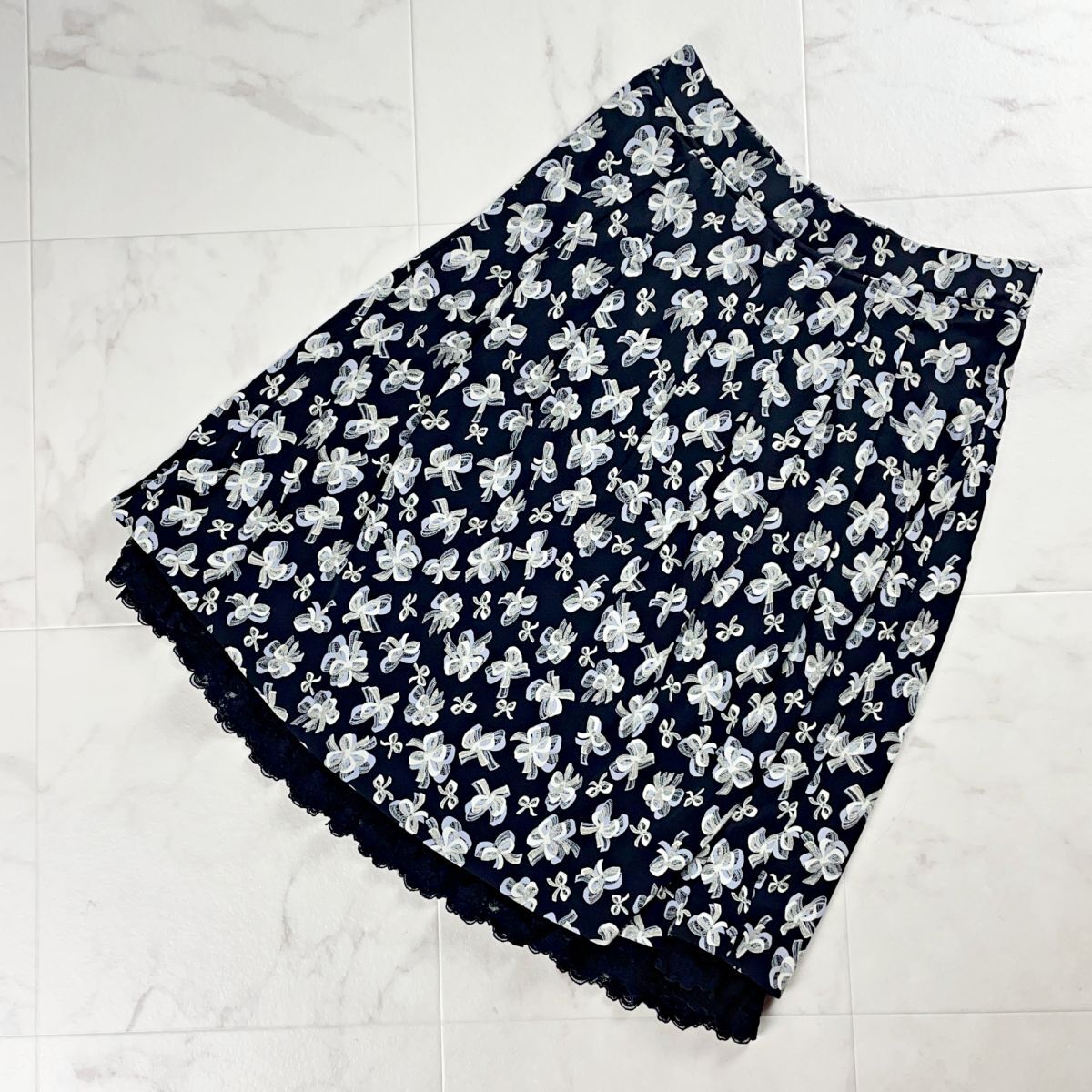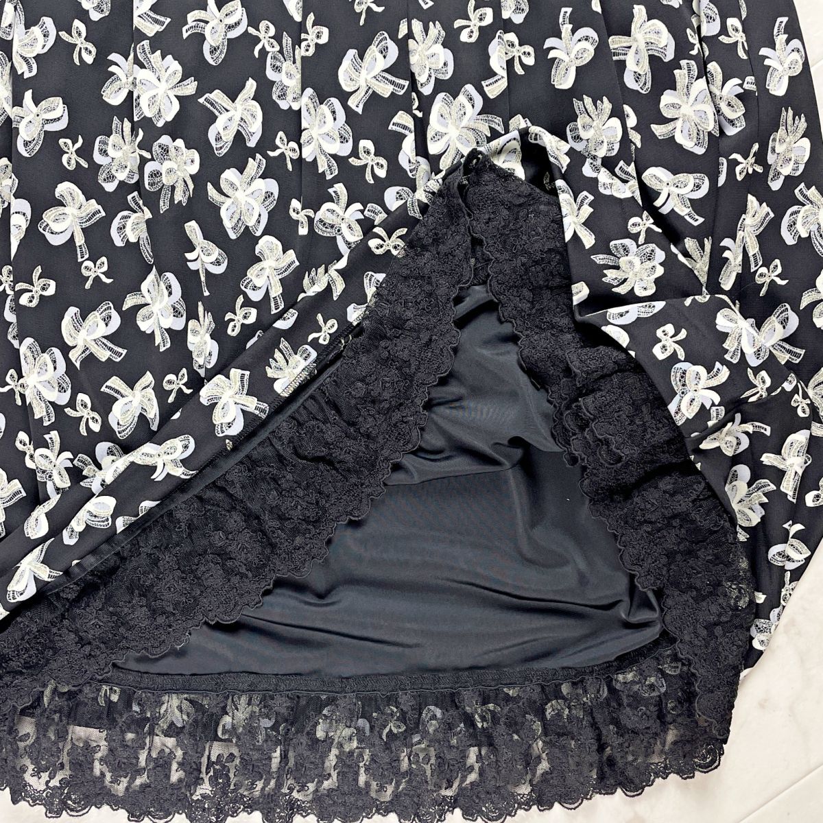 美品 INGEBORG インゲボルグ リボン柄 フレアスカート ひざ丈 刺繍レース 総柄 黒 ブラック サイズ9*VC114