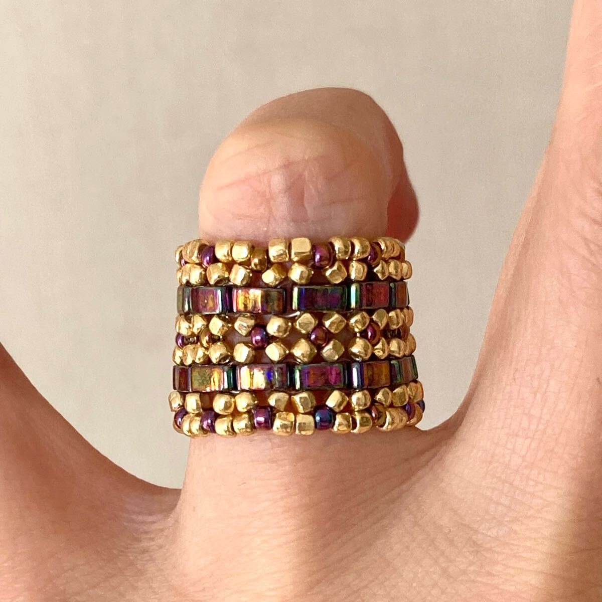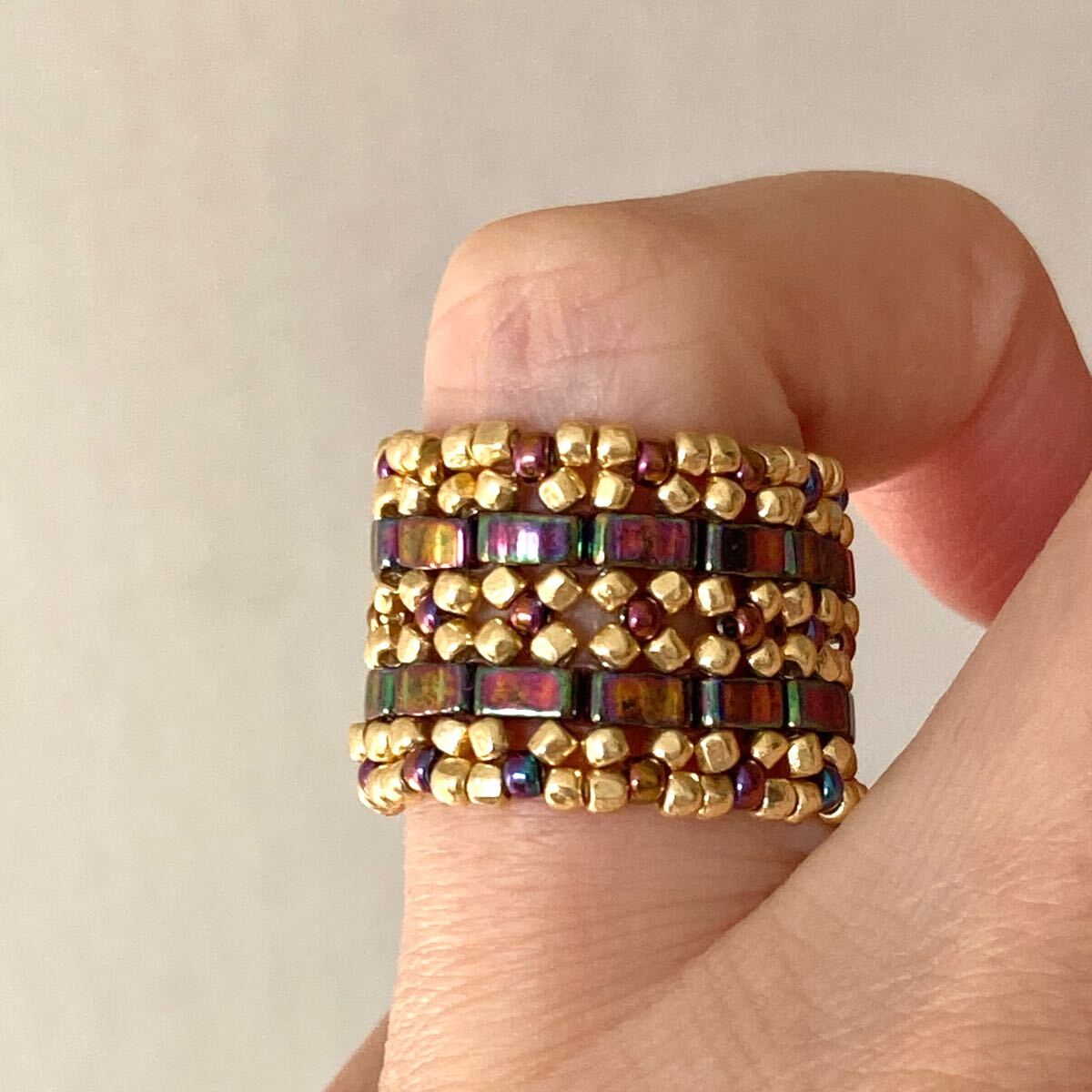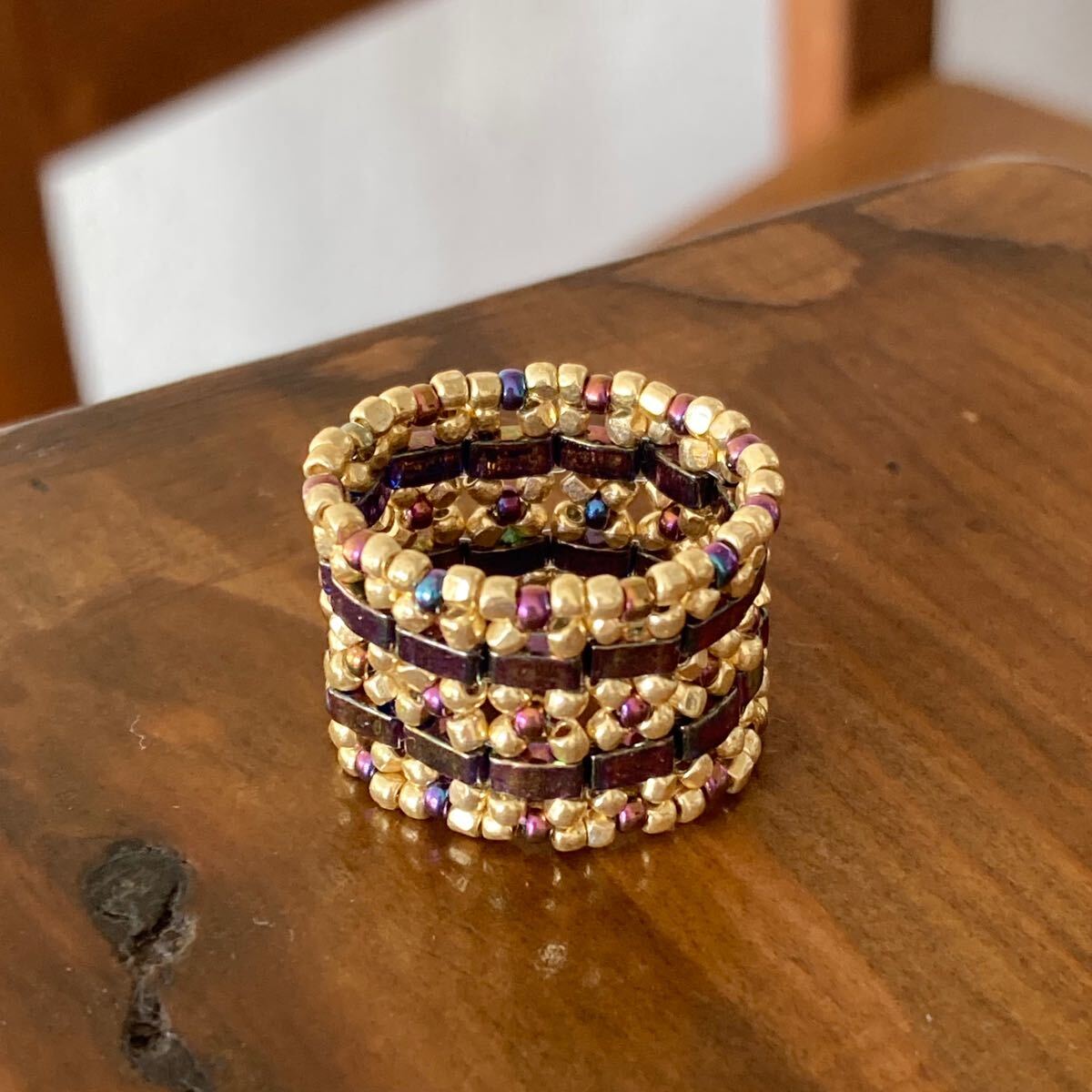 ハーフティラビーズとゴールドのスリーカットビーズを交互に編んだワイドリングです♪