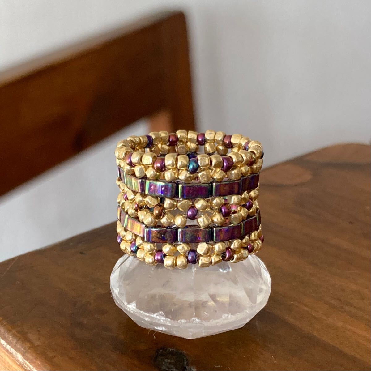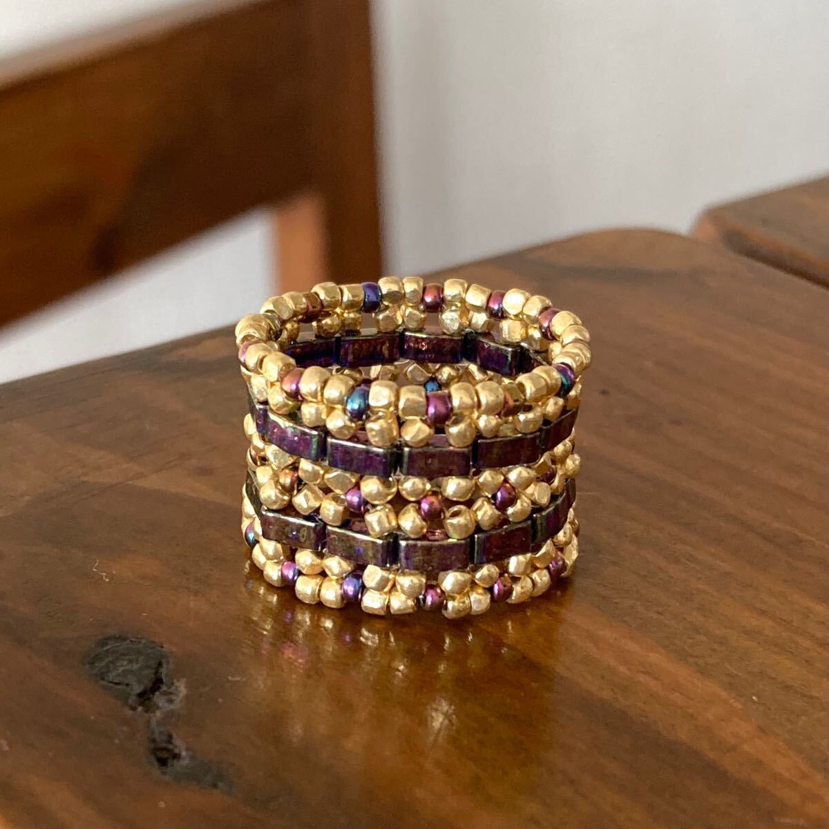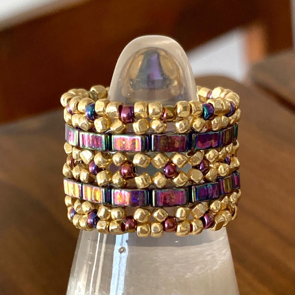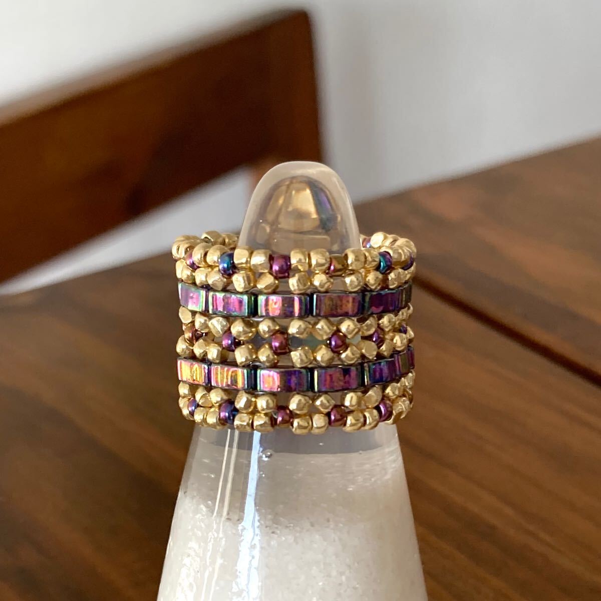 玉虫系パープルのハーフティラビーズ、ゴールドのスリーカットビーズ、玉虫系メタリックカラーの丸小ビーズで作ったリングです。