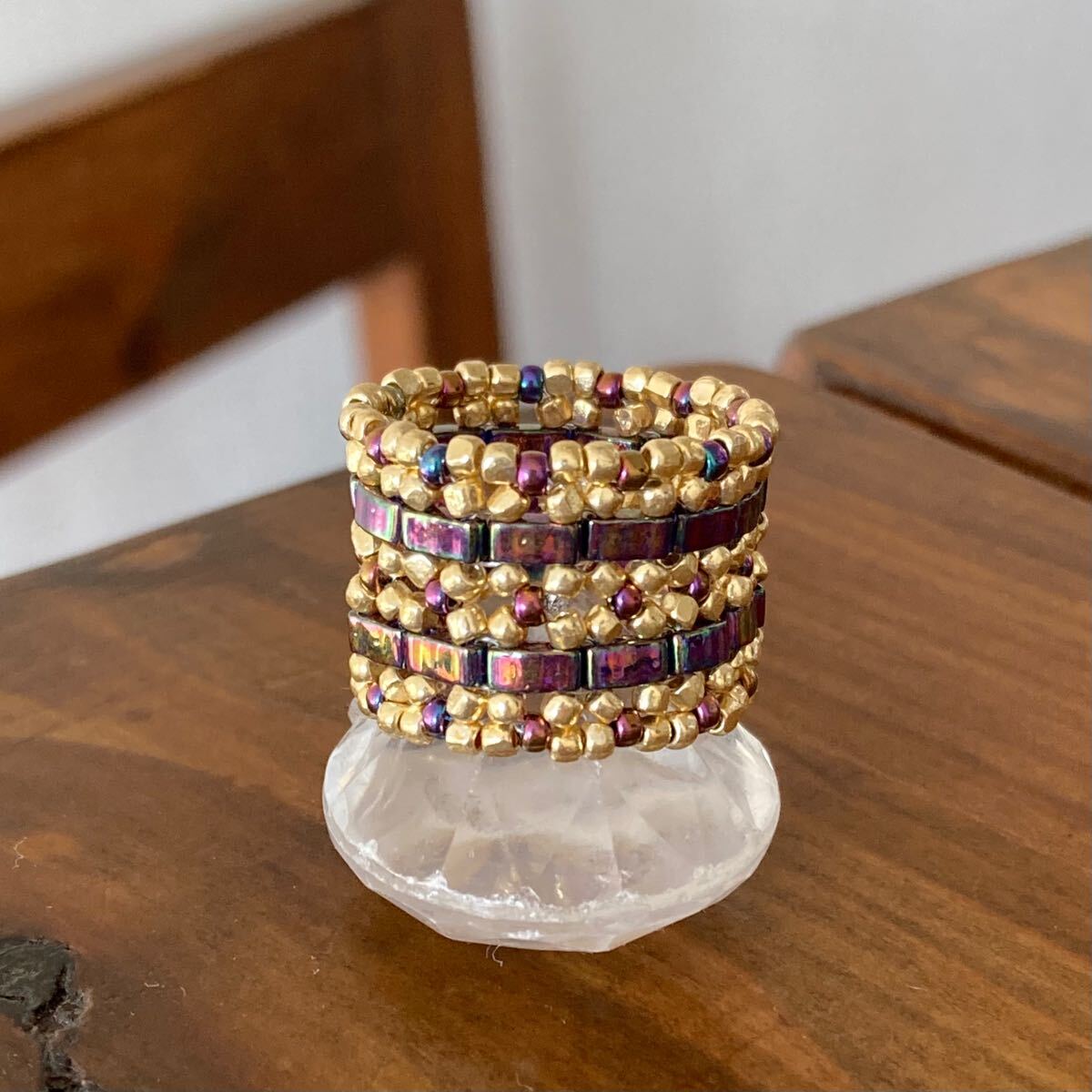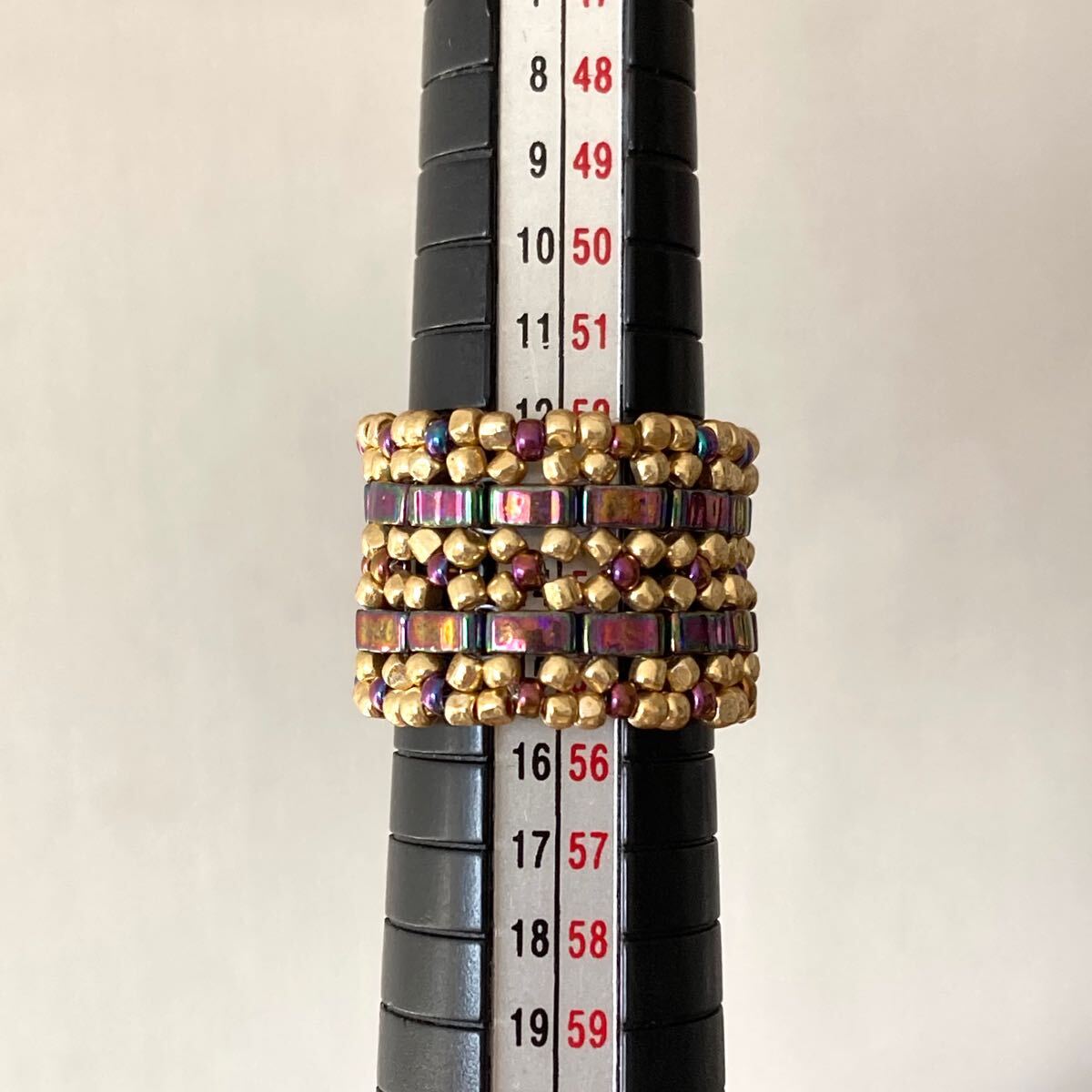ビーズ リング 指輪 ハンドメイド ハーフティラビーズのワイドリング 玉虫系パープル×ゴールド 12-14号です。
