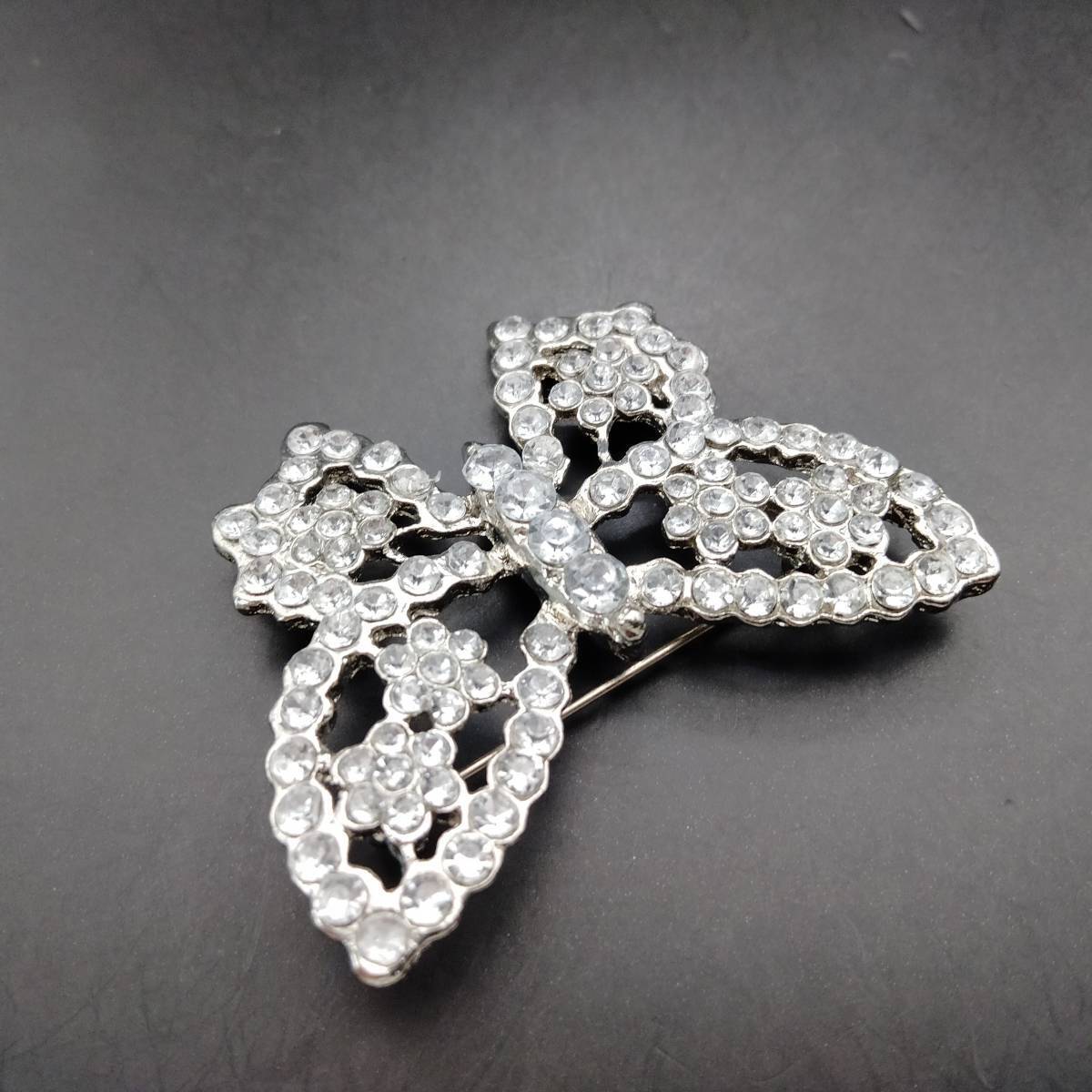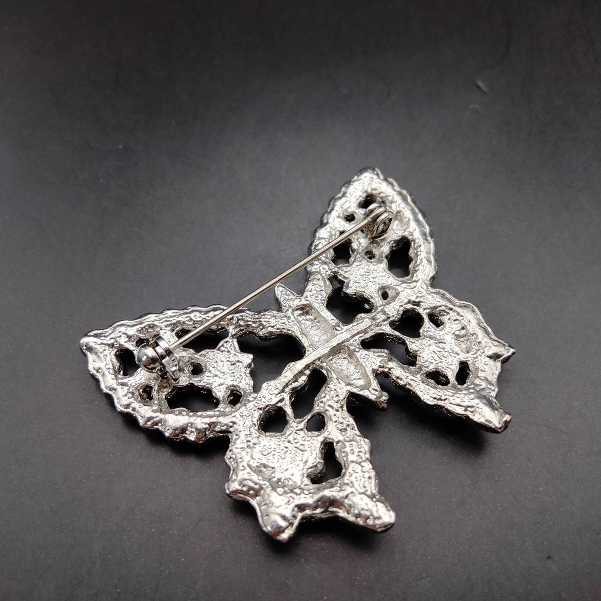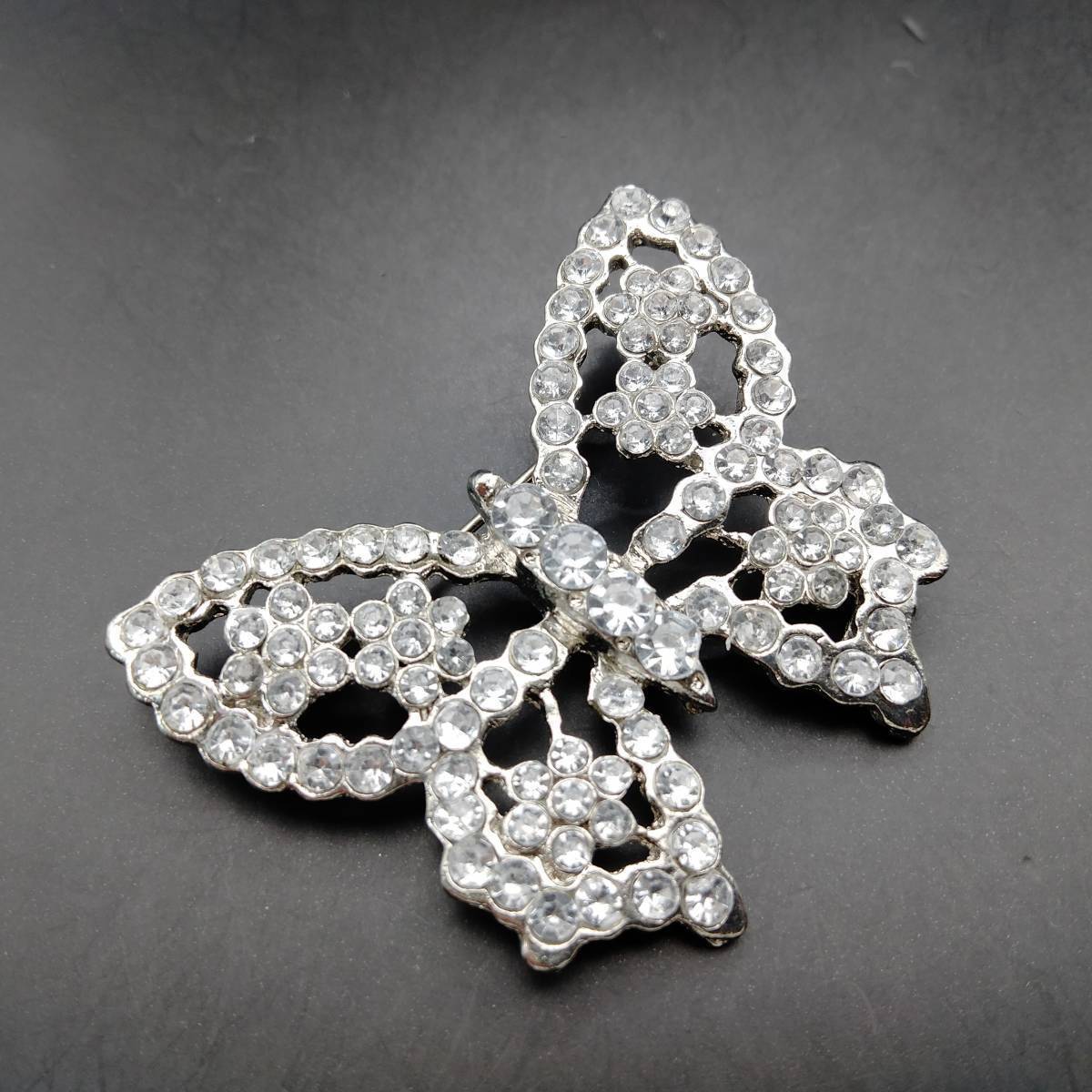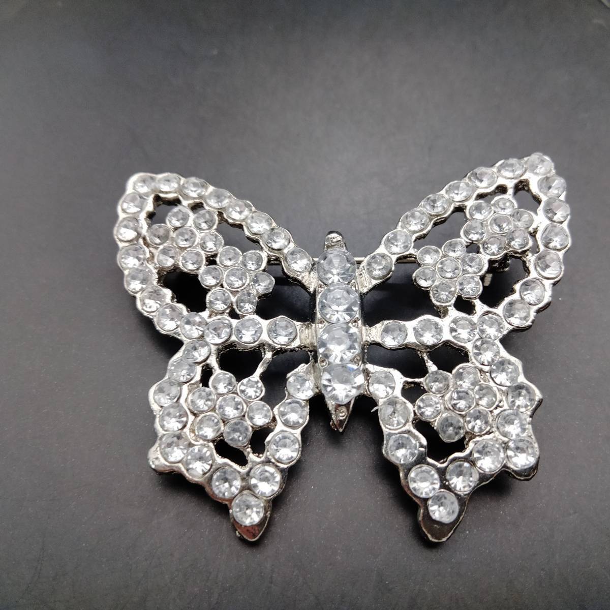 シルバーの蝶 ラインストーン装飾 煌めき ヴィンテージ ブローチ 大ぶり ファッションジュエリー 存在感 透かし 昆虫モチーフ Y20-C
