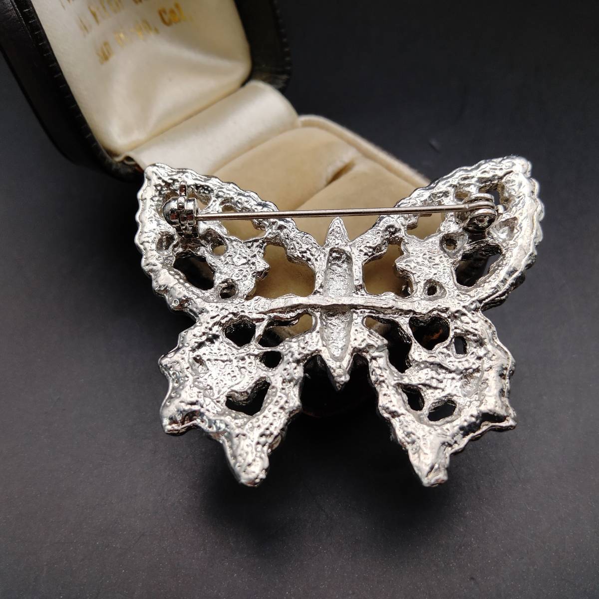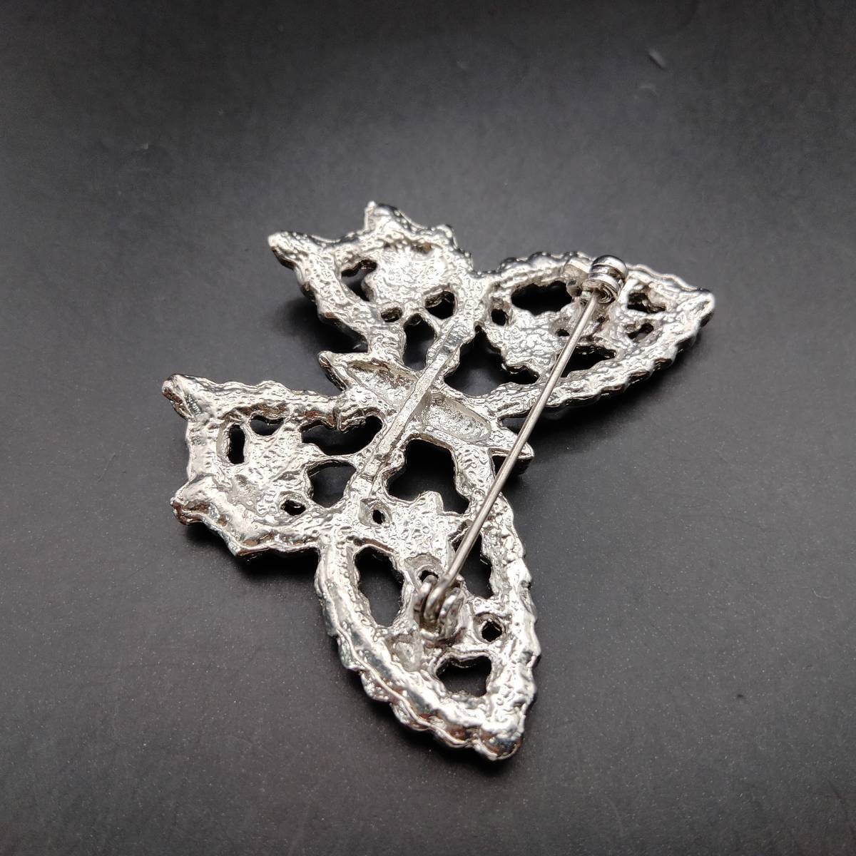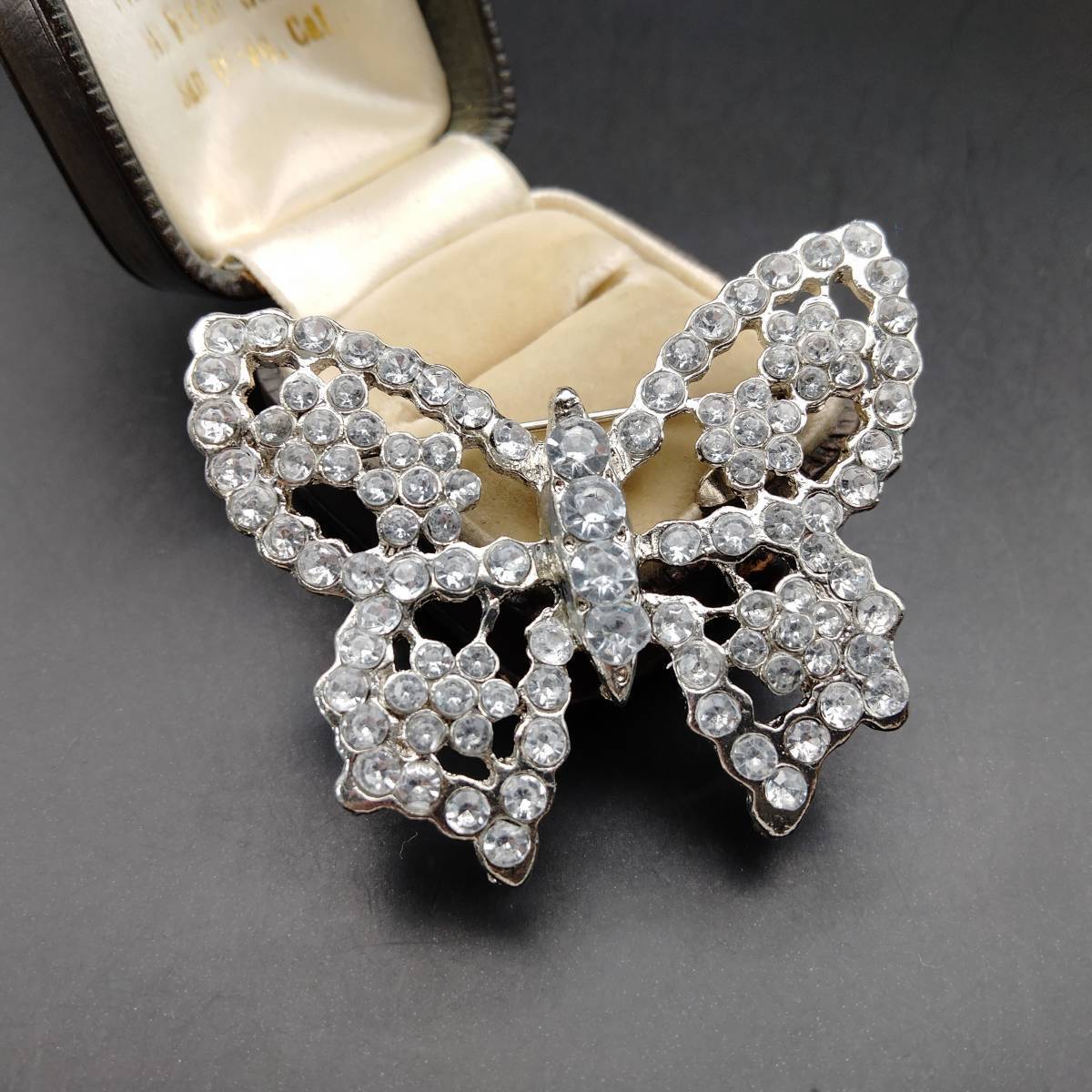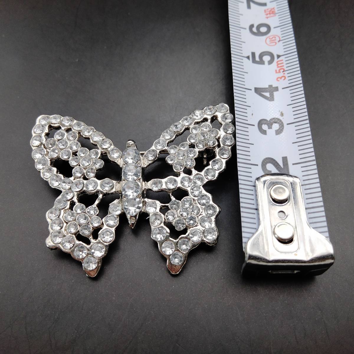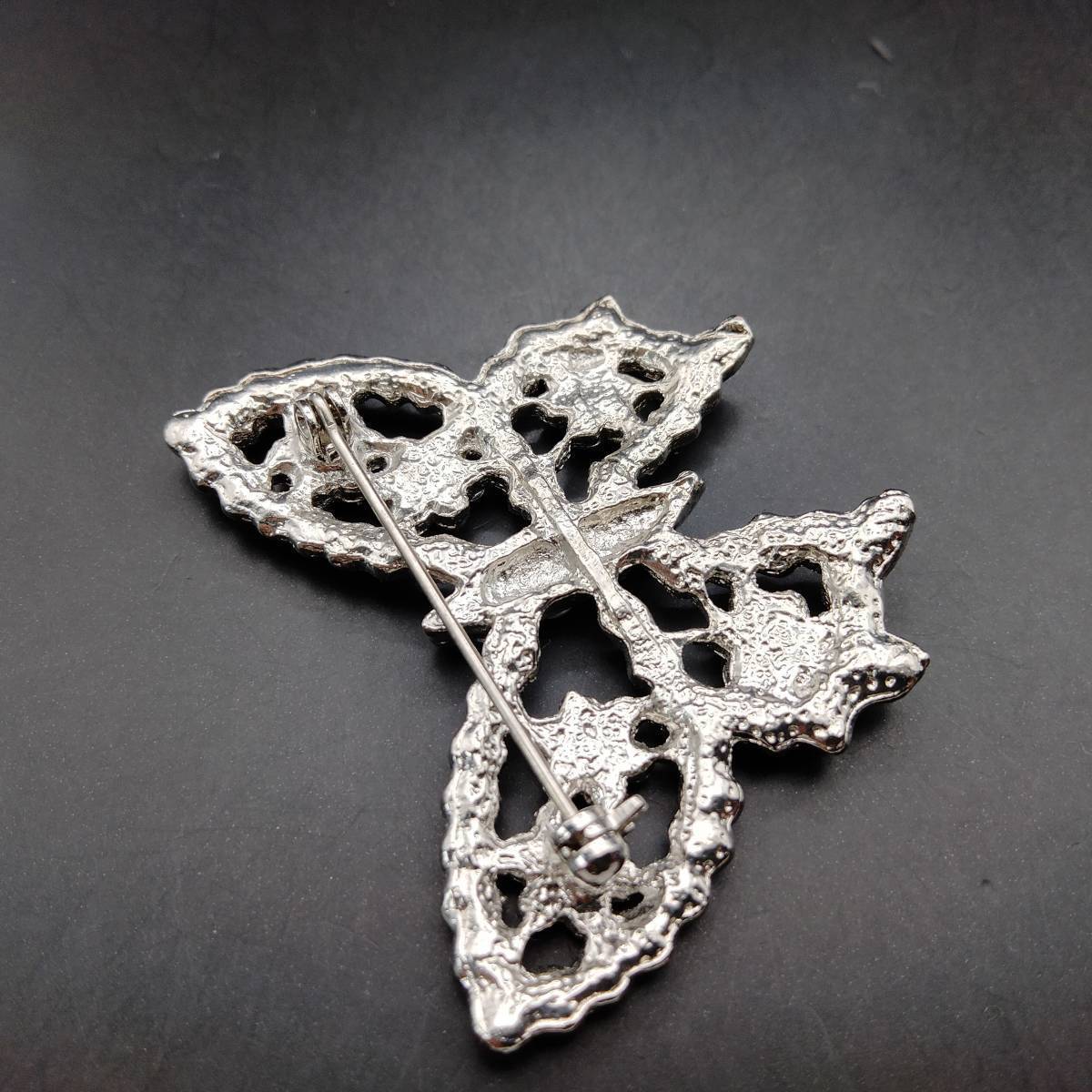 シルバーの蝶 ラインストーン装飾 煌めき ヴィンテージ ブローチ 大ぶり ファッションジュエリー 存在感 透かし 昆虫モチーフ Y20-C
