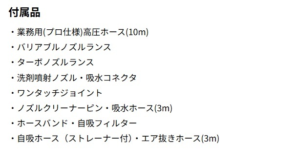 本体×1個・ガン×1個・高圧ホース(プロ仕様/10m)×1個・吸水ホース(3m)×1個・洗剤噴射ノズル×1個