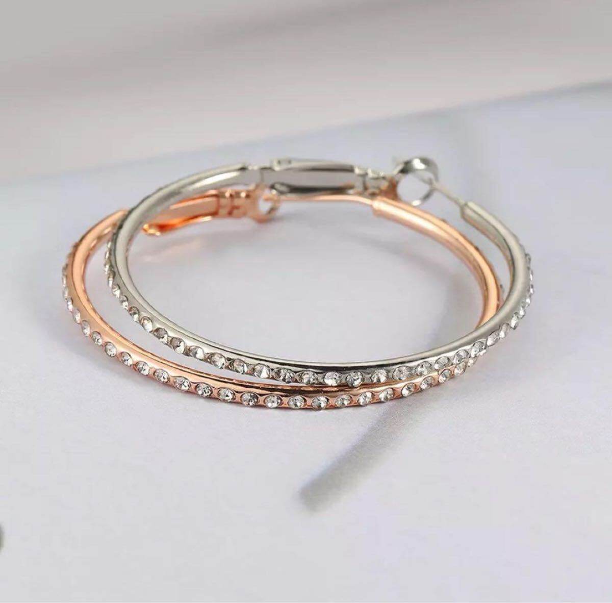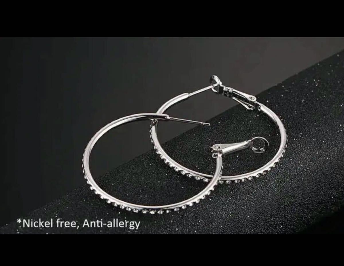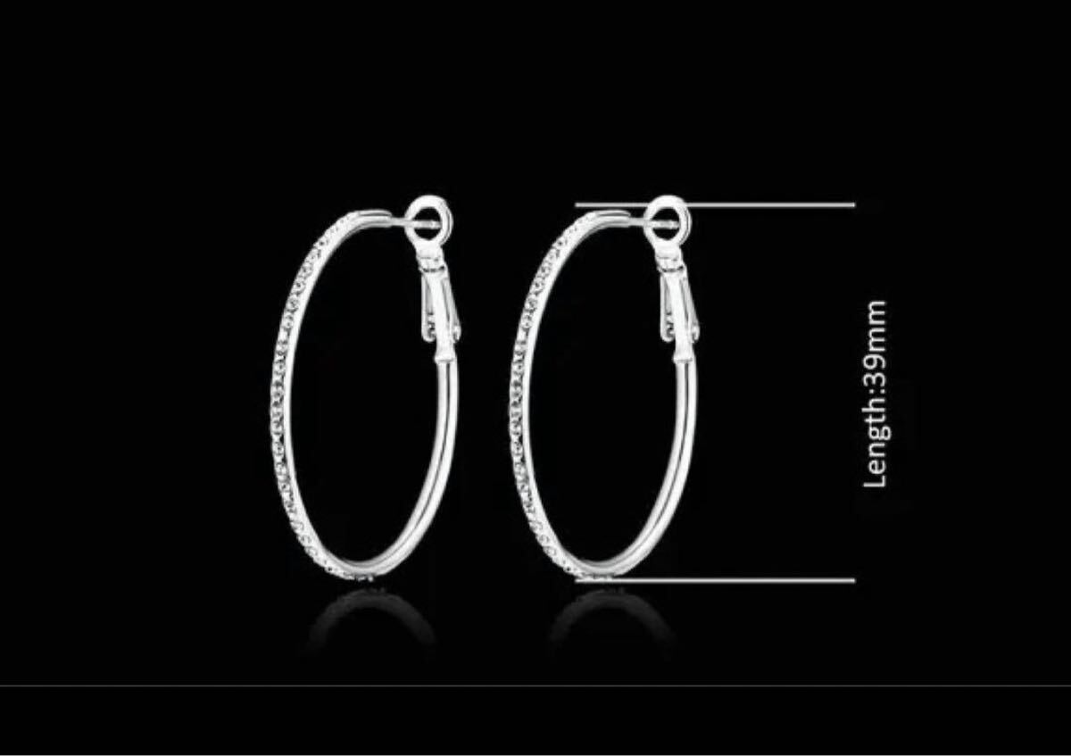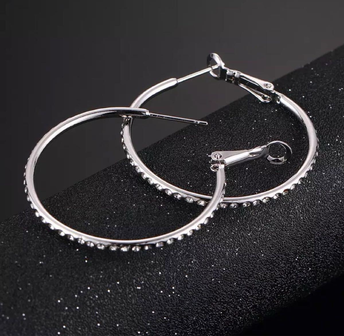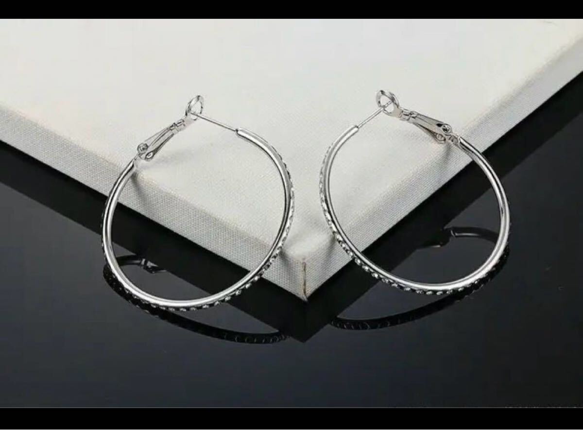 このシルバーのフープピアスは、クリスタルの装飾が施されており、シンプルながらも華やかな印象を与えます。
