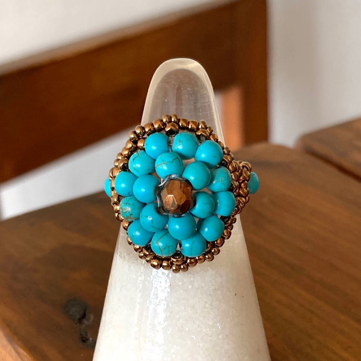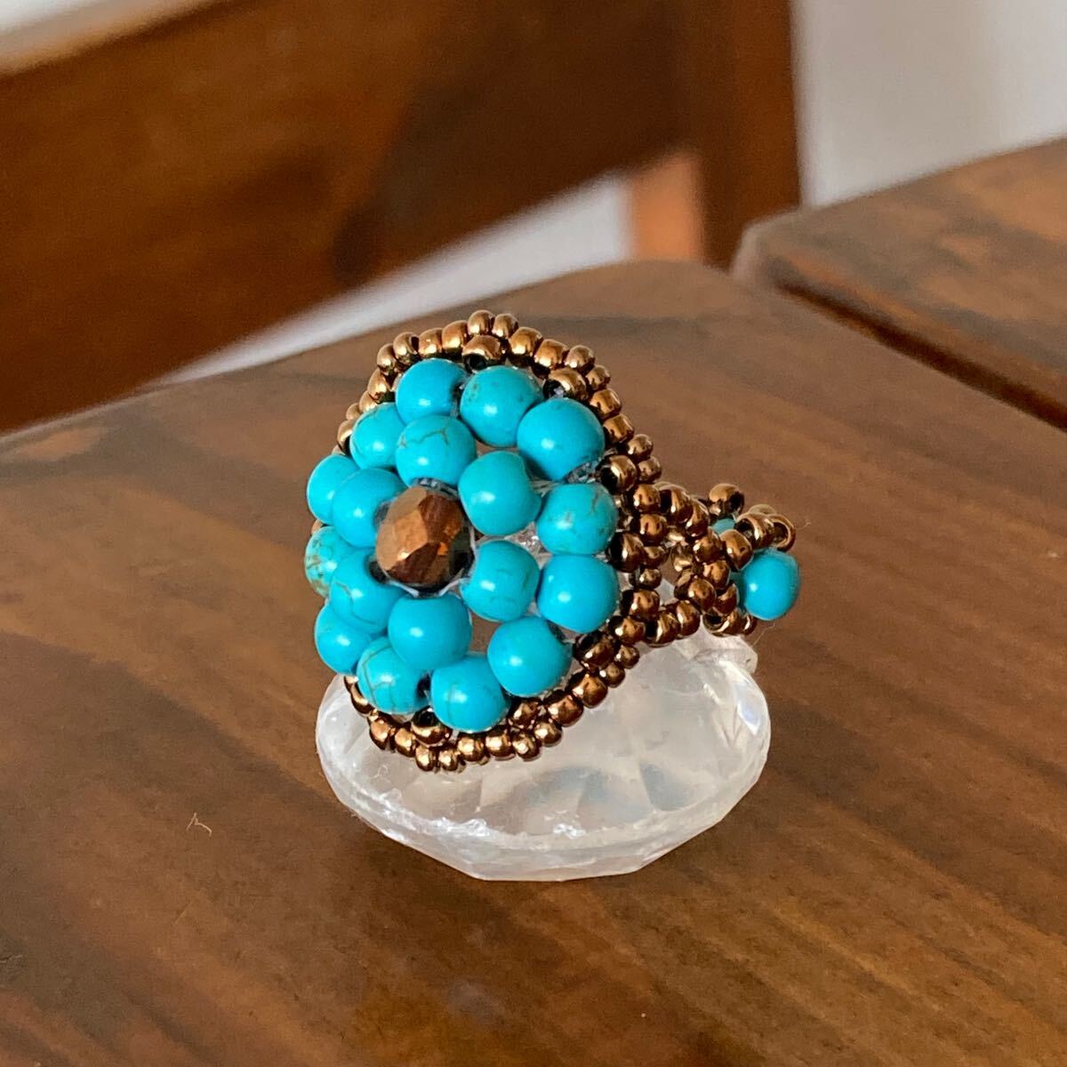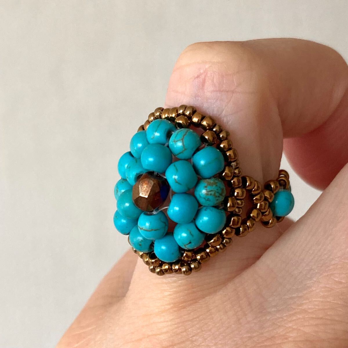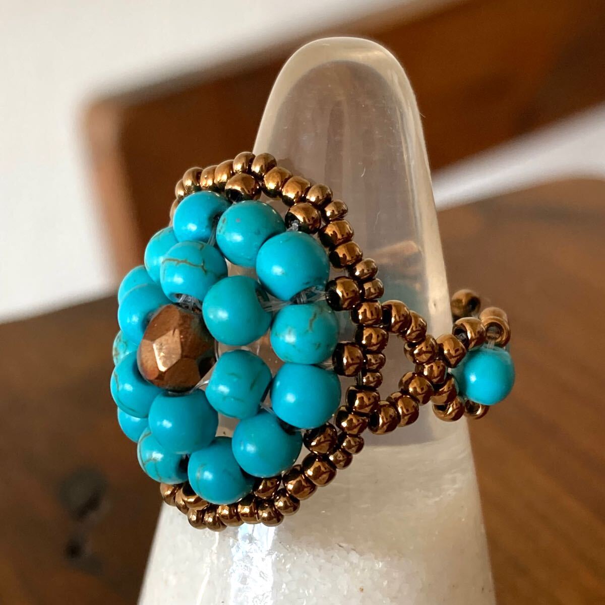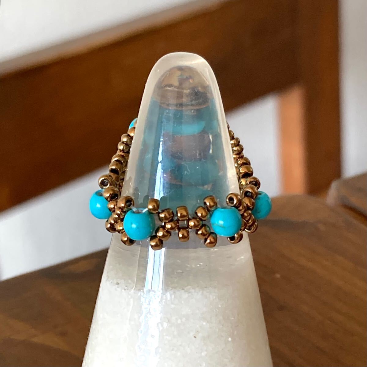 丸型に編んだ練りターコイズビーズの周りをブロンズの丸小ビーズで縁取ったデザインのリングです♪