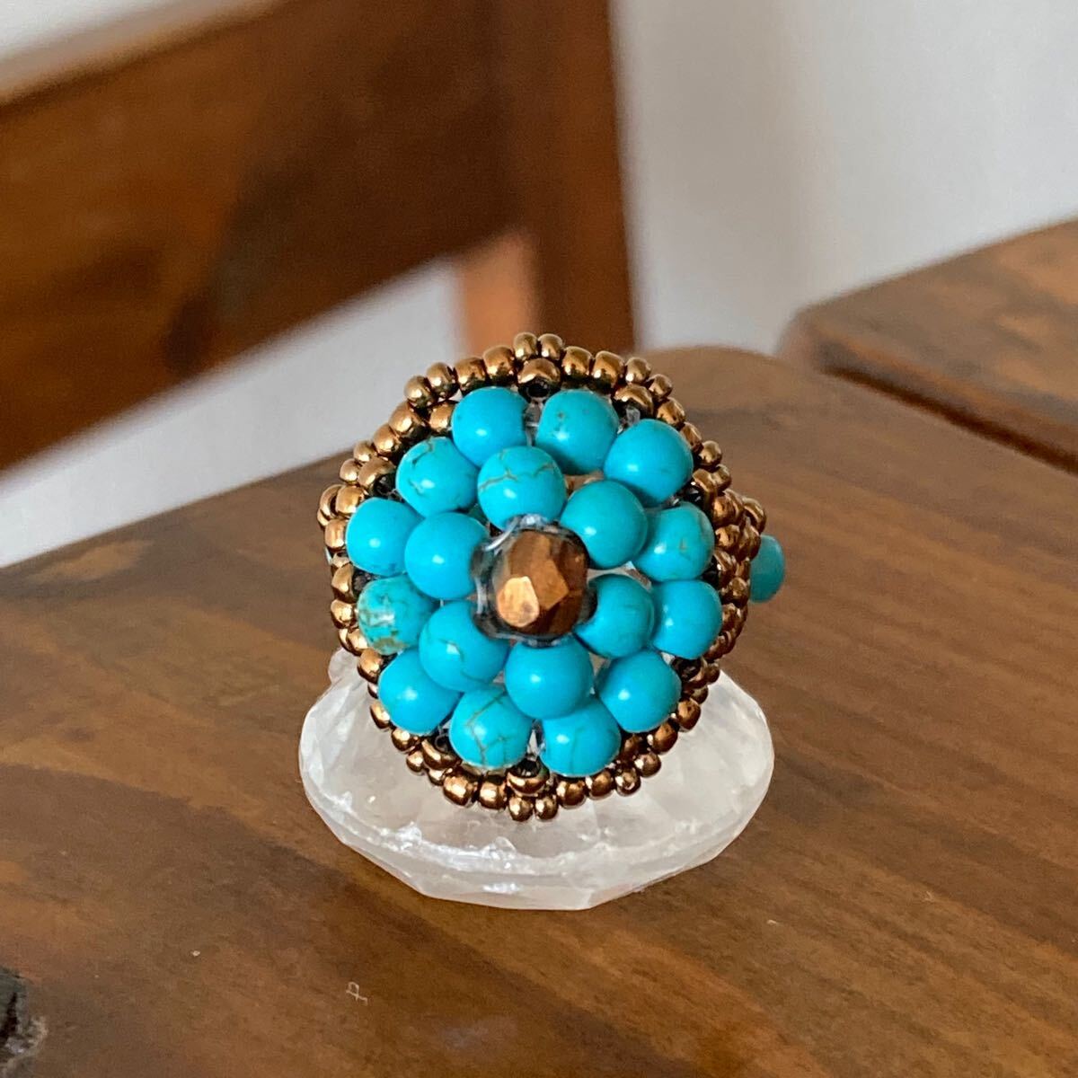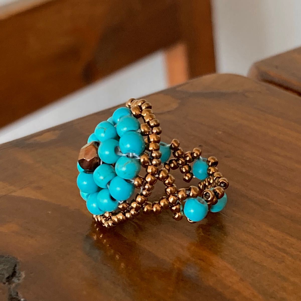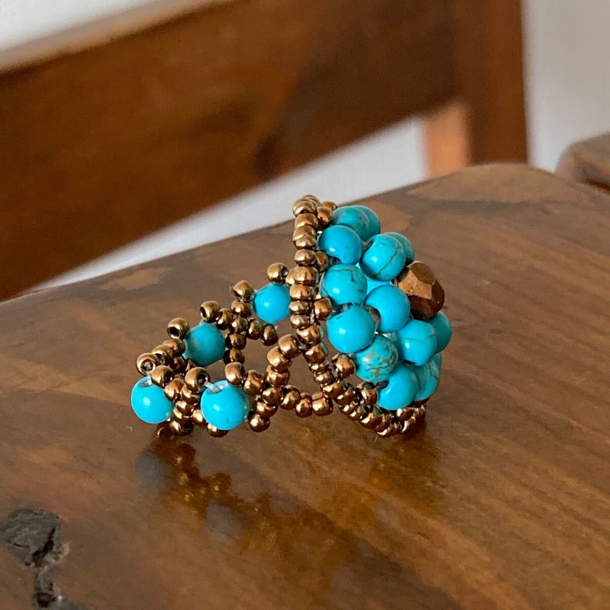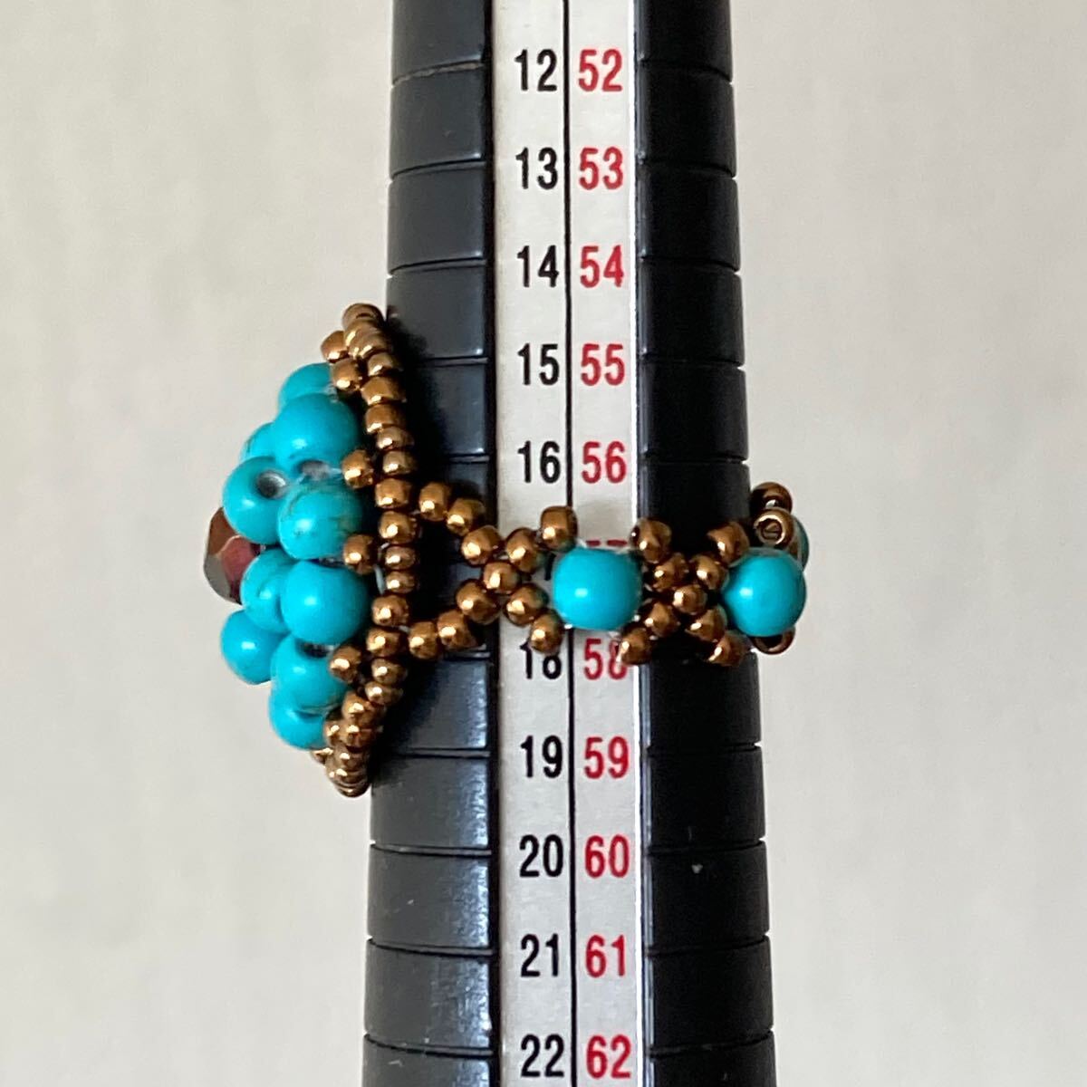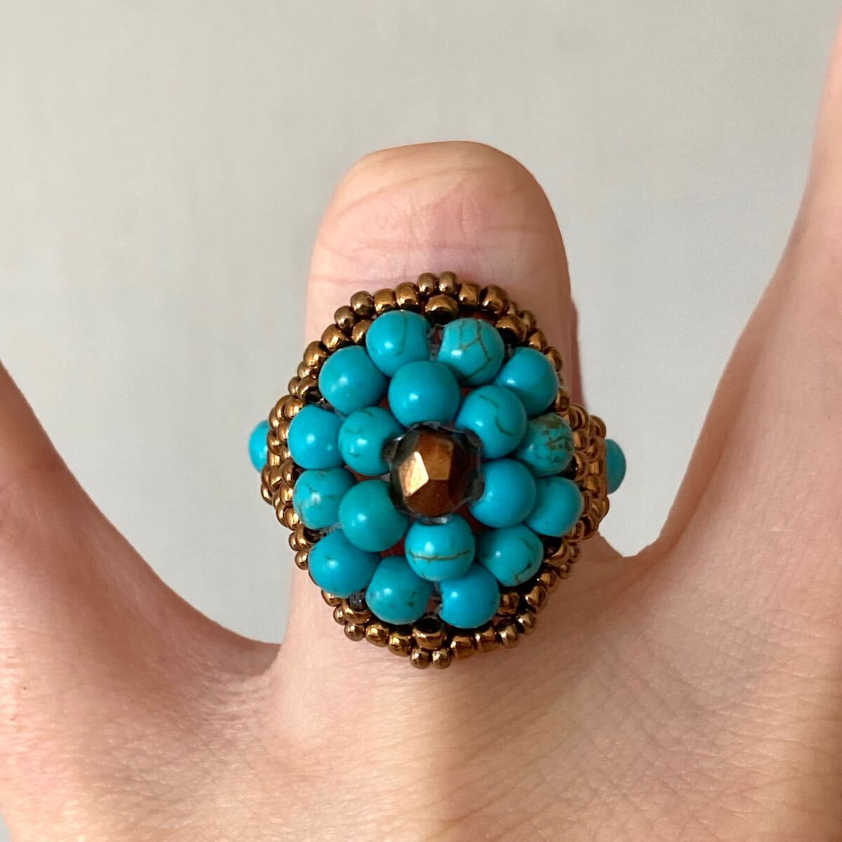 丸型に編んだ練りターコイズビーズの周りをブロンズの丸小ビーズで縁取ったデザインのリングです♪