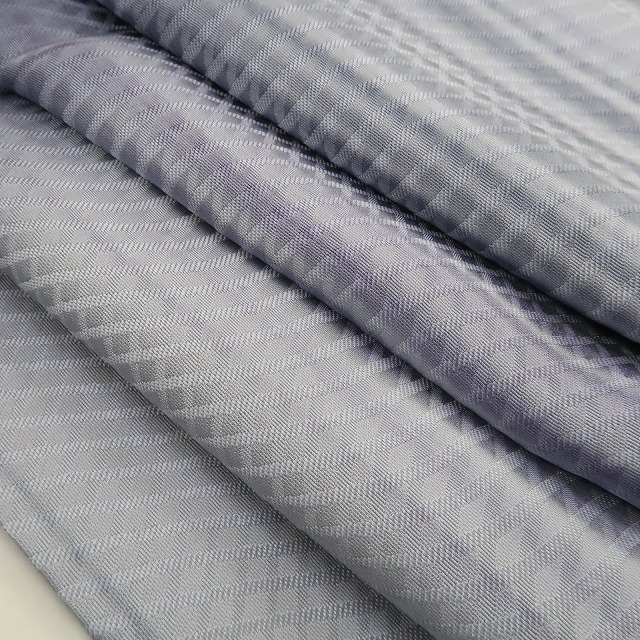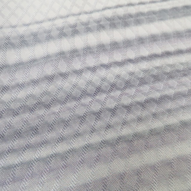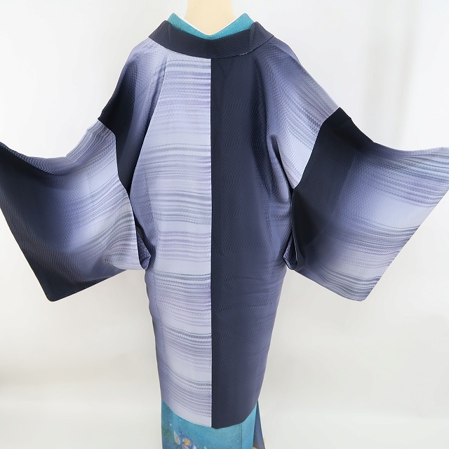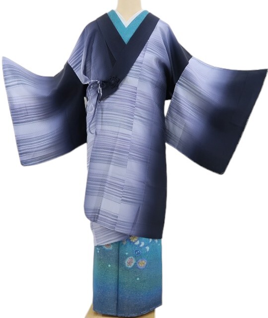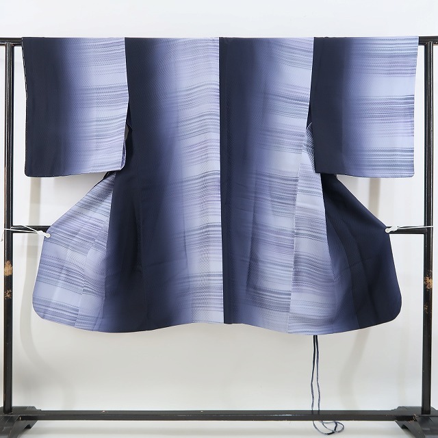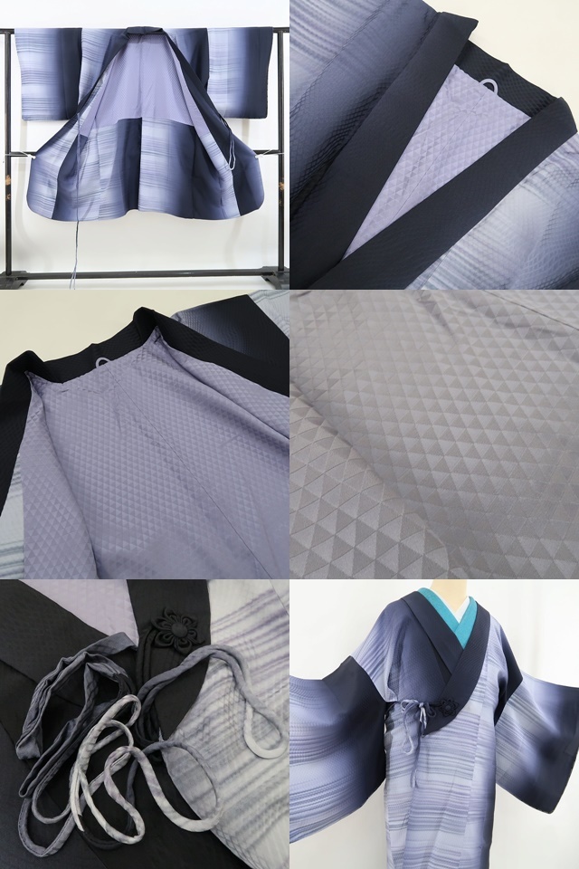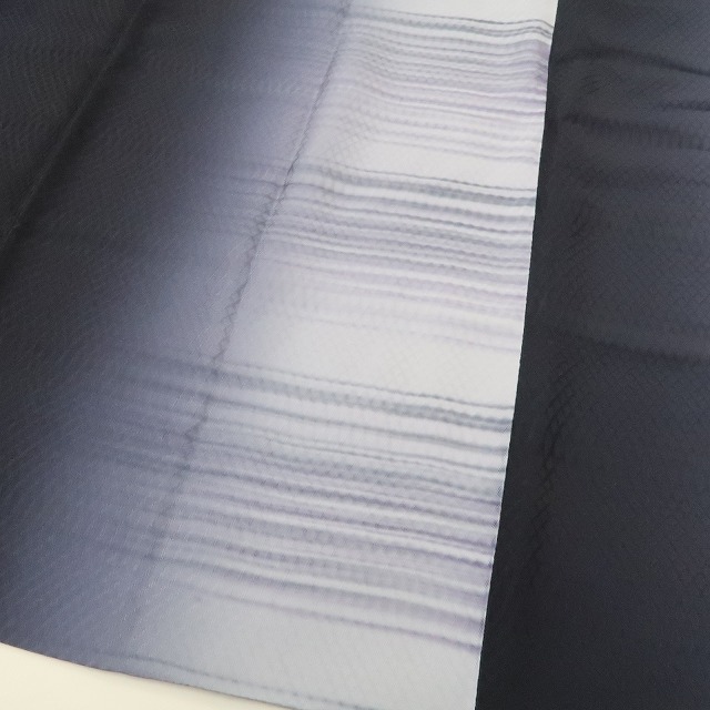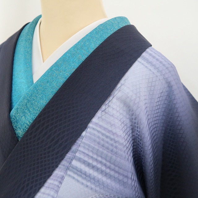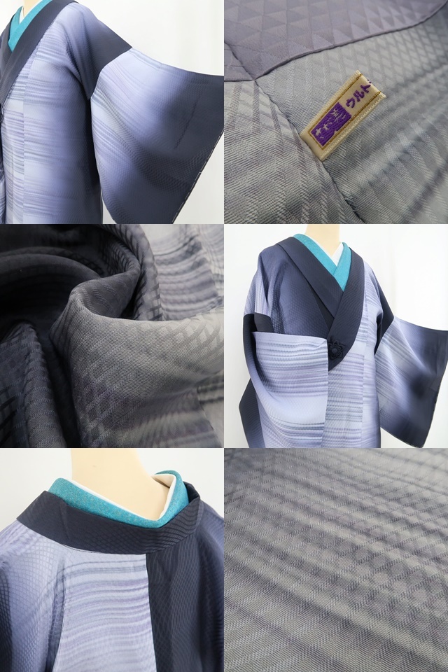 縦縞状に彩られた藍鉄色と藤鼠色の艶めいた濃淡、謎めいて浮かび上がる籠目状のデザインモチーフ、不思議な視覚のインパクトに醸し出されるこの上ないお洒落感は必見の価値あり!正絹素材のしっとりとした艶が和モダンな潤いを一段と美しく際立たせています。