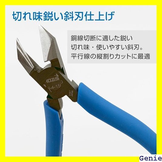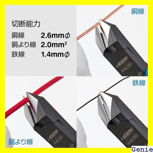 ・【切断能力】銅線:2.6mmφ、銅より線:2.0mm^2、鉄線1.4mmφ【硬度HRC】刃部:58【重量】140g【全長】158mm【用途】電子部品・ハンダ・銅線の切断、電線の切断や被覆剥離、配線工事、電子機器や精密機械の組み立て・修理、電子工作、プラモデル・模型・アクセサリーの製作、ワイヤーワーク、釣り針の製作や修理