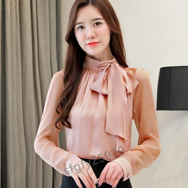 J721☆新品春 エレガント レディース ボウタイブラウス 長袖 リボン ブラウス シャツ ハイネック ブラウス S~3XL グレー