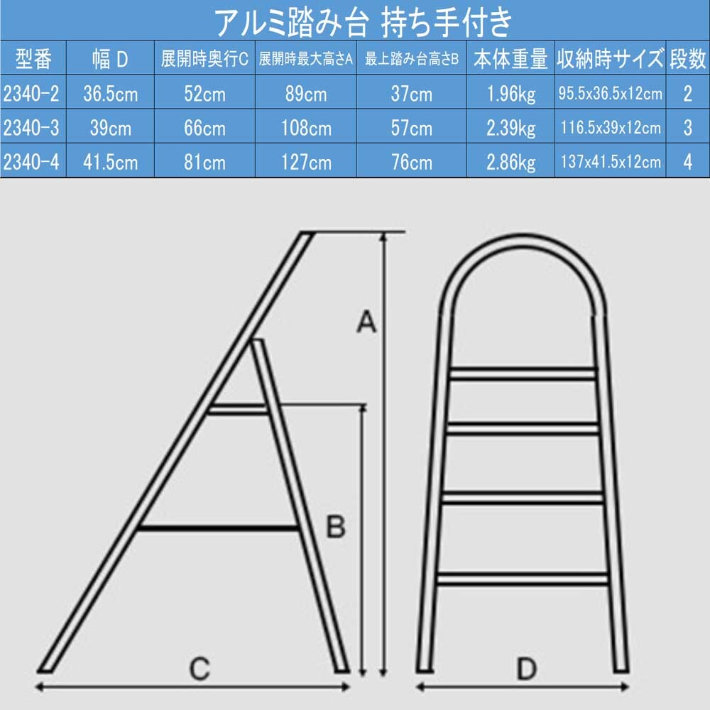 商品説明 | 一家に一台あると便利!照明器具の取り替えや高い位置になる棚から物を取り出せる持ち手付折りたたみステップ台です。 【商品寸法】 広げた状態:幅41.5cm×奥行81cm×高さ127cm 収納時:幅41.5cm×奥行8cm×高137cm 耐荷重:約100kg 素材:アルミ 重量:2.86kg 【商品素材】 アルミ/ 持ち手付き四段踏み台 【上り下りしやすいつくり】 持ち手を掴んで上り下りしやすいつくりで、安定感がアップできます。壁の掛け替えや、照明の交換、窓のクリーニングなど、自分で作業するが必要のある方におすすめします。 【安全な構造】 接続部分もしっかりしていますので安定感があります。 足底の滑り止めテクスチャにより摩擦力がアップし、安全にお使いいただけます。また、床、タイルを傷つけません。 |