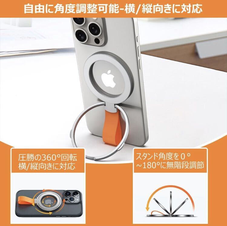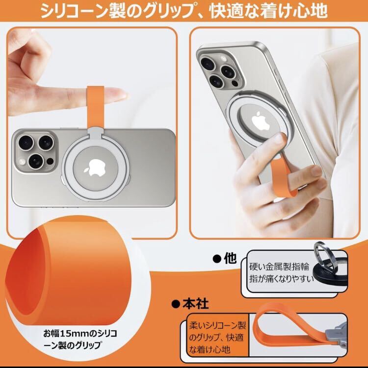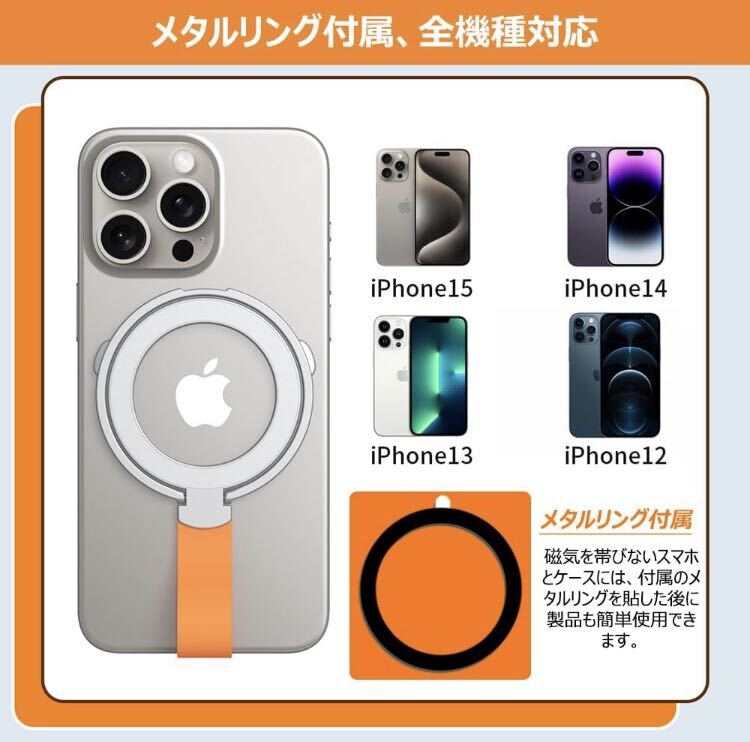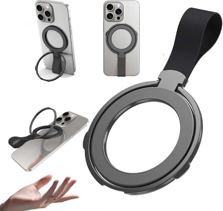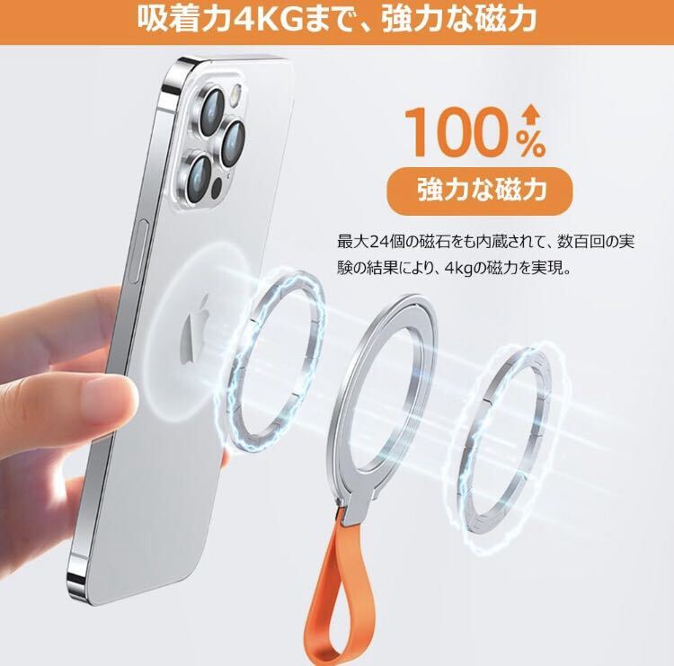 スマホマグネットリング 手提げループ付きMagsafe対応 360度回転 角度調整可能 バンカーリング スマホスタンド機能 超磁力 簡単着脱 薄型 高級合金素材 Phone 15/14/13/12シリーズ/Androidに対応