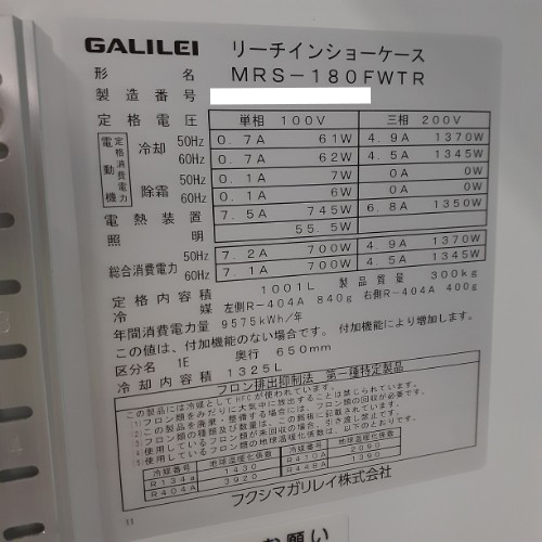 【業界最長1年保証】冷凍リーチインショーケース フクシマガリレイ(福島工業) MRS-180FWTR 業務用 中古/送料別途見積