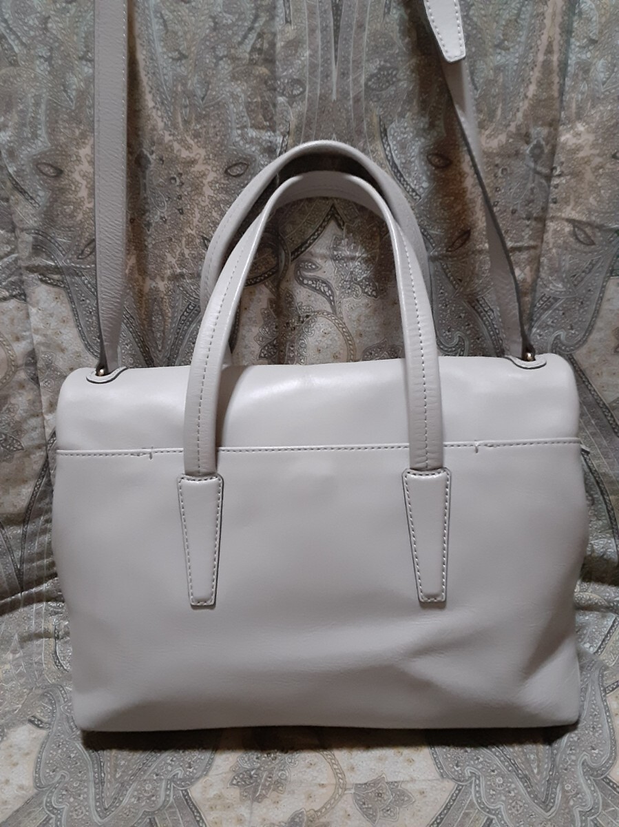 ☆女性らしいパステルアイボリーとグレー系の上品なバイカラーのSAZABYバッグです。