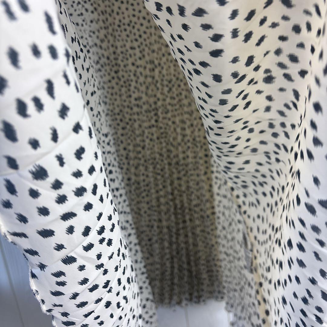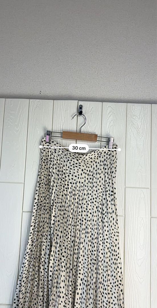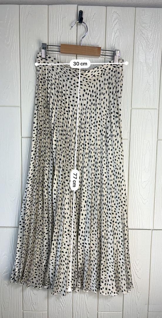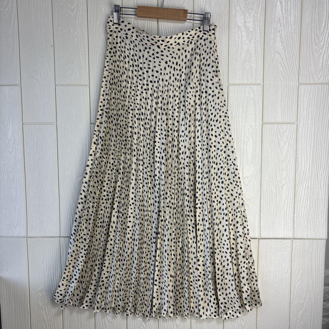 クリーム色に黒のドットが施された、エレガントなプリーツスカートです。シンプルながらも目を引くデザインで、様々なコーディネートに合わせやすいアイテムです。