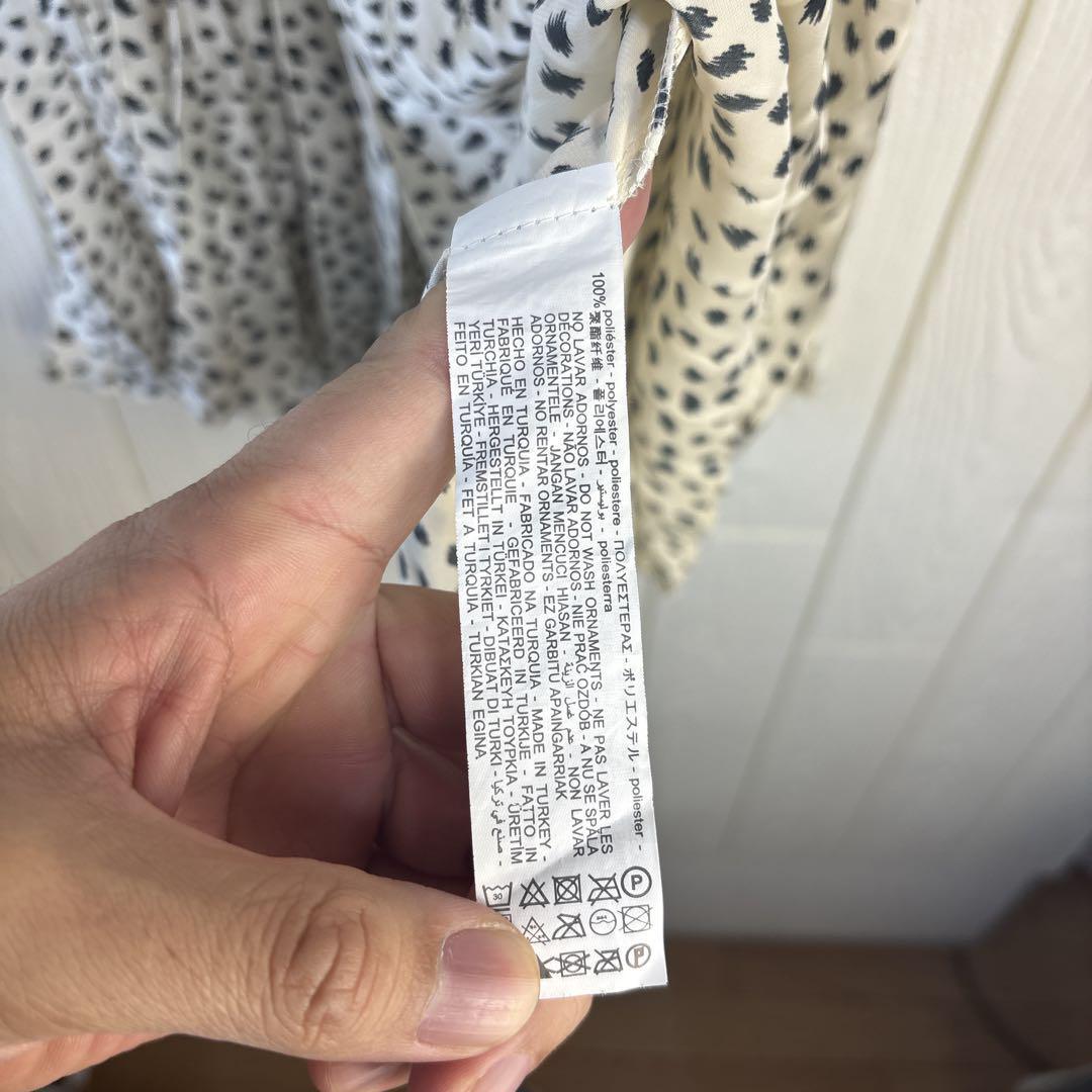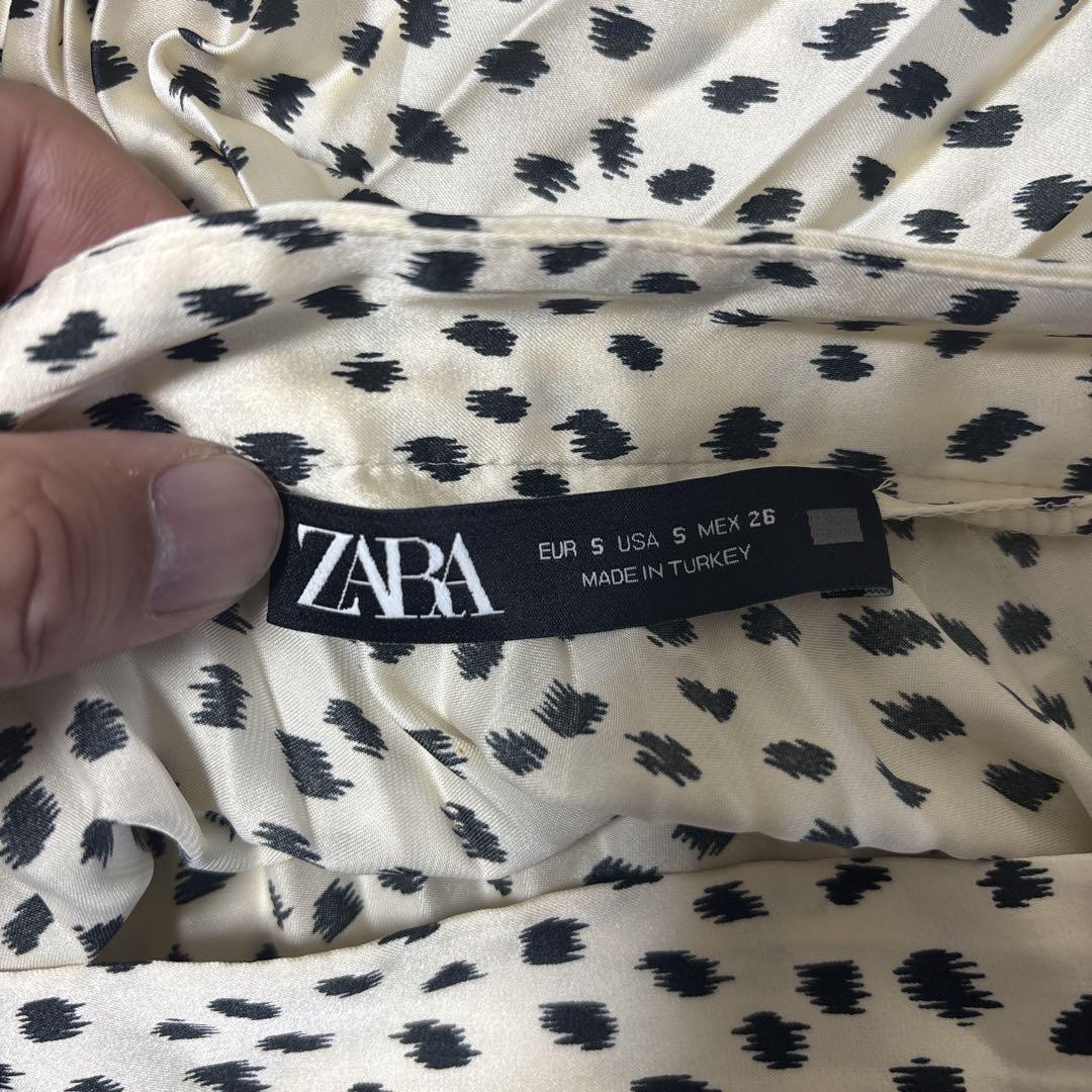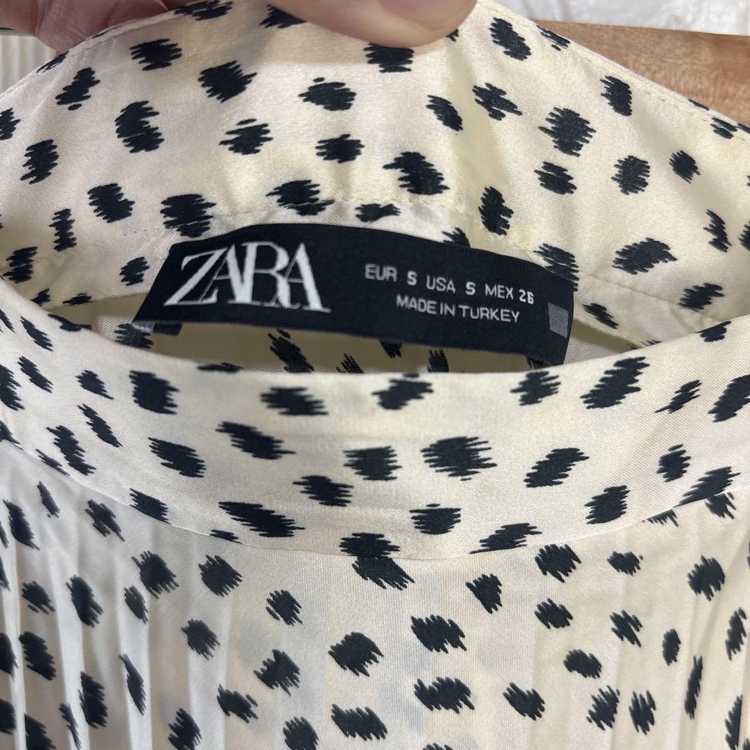 クリーム色に黒のドットが施された、エレガントなプリーツスカートです。シンプルながらも目を引くデザインで、様々なコーディネートに合わせやすいアイテムです。