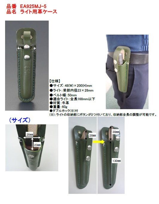 | 【商品説明】 ESCO 48x200mm ライトケース(牛革・OD色) EA925MJ-5新品になります。 サイズ 48(W)×200(H)mm ライト受部内径 23×28mm ベルト幅 50mm 適合ライト長 全長168mm以下 材質 牛革 重量 60g 適合品番(一例) EA758RK-3、-53A、-63、-73、 EA758RM-75、EA724XA-15 日本製 ダブルホック(※)付 (※):ライトの収納部にボタンが2つ付いており、 収納部全長の調整が可能です。 在庫状況が常時変動しております必ず購入前にご質問ください。 ※本商品は改良や定期的に仕様変更される場合がり実際の写真と異なる場合がございますが同型番の改良された商品は新型の商品となりますのでご了承ください。 スペック等の変更はございませんご安心してお使いください。本品は別倉庫に在庫がある為入金確認後から納期が数日かかりますご了承の上ください。 ※また製品改良のため、素材・形状など一部仕様が変更になる場合がございますが、機能・品質等使用上は問題なくご使用になれますのでご安心ください。 改良や仕様変更された商品は実際の写真と異なる場合がございますが同型番の改良された商品は新型の商品となりますのでご了承ください。 本商品のメーカーでは仕様変更及び改良はメーカーで常時行われております画像にございます工具等は付属しておりませんご注意ください。 画像は代表イメージです。 本品は新品、未使用品ですが箱等に多少の汚れ細かな傷等がある場合がございますご了承ください。 完璧な商品を求める神経質な方はご入札なされないようお願いいたします。 ノークレーム、ノーリターン、ノーキャンセルでお願いいたします。 上記の記載をご理解の上ご購入のご検討をお願い致します。 【お支払方法】 ゆうちょ銀行、 ジャパンネット銀行 楽天銀行 【発送について】 沖縄・離島は別途送料がかかりますので、お問い合わせください。 注意事項 当店での出品中の商品は店頭と他サイトとの同時販売の為在庫切れなどの場合もございます、在庫切れの場合納期がかかります入札前に必ずご質問ください。 送料と振込手数料はお客様ご負担になります入金の確認後発送とさせていただきます。送料料金に関しましては梱包手数料梱包費が含まれております。 商品説明にもございますよう、多少の汚れ等ございます。完璧な商品を求める方は、入札をお控ください。 お客様都合による返品・交換は一切受け付けておりませんので、必ず詳しい程度をご確認の上ご入札下さい。気になることがございましたらご遠慮なく質問して下さい。 発送時期によりパッケージの仕様の変更が常に行われております中身自体は同等品ですが梱包パッケージや柄が変わる場合がございますご了承ください。 撮影時の状況及びお客様のPC環境等の諸事情により実際の色目と違って見える場合がございますのでご理解のうえご入札お願い致します。 在庫切れ等の場合出来る限り早急発送を心掛けておりますが、出荷まで数日かかる場合がありますので、お急ぎのお客様は在庫等お問合せ下さい 配送に補償がついておりません補償発送をご希望の方は申し出ください。ノークレーム、ノーリターンノーキャンセルでお願い致します。 土、日曜日、祝祭日、はネット業務はお休みのため、商品の発送及びご連絡等、質問への解答 が休日あけに遅なる場合がございますがご了承ください。 管理番号ESCO 48x200mm ライトケース(牛革・OD色) EA925MJ-5 |
