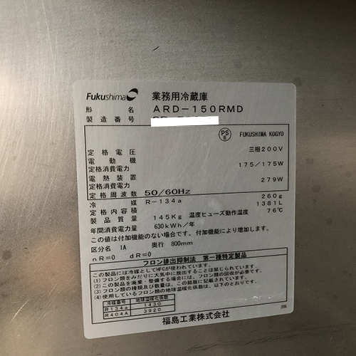 【業界最長1年保証】縦型冷蔵庫 フクシマガリレイ(福島工業) ARD-150RMD 業務用 中古/送料別途見積