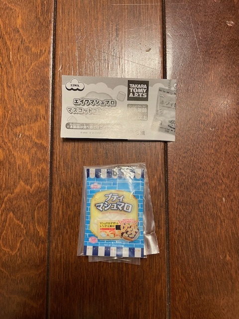みんなが知っているエイワのマシュマロが、ボールチェーン付きのミニチュアマスコットになりました。プニプニした生地を使用し、本物のマシュマロのような感触を実現!カラフルなパッケージは、裏側まで細かく再現されています。全6種のうち「プティマシュマロ」になります。本体サイズは約4.8〜6cmです。フィギュアは勿論内袋未開封、リスト付きです。300円フィギュアですが細部までリアルに仕上がっています。