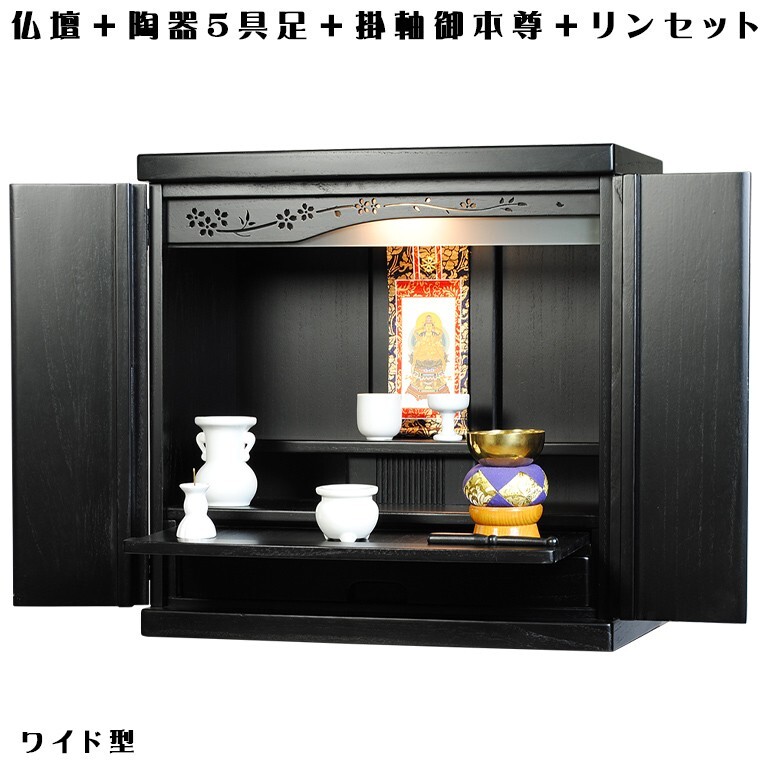 【ワイド型】【ご本尊+陶器5具足+りんセット+掛軸留め】【未来18号ワイド・ブラック(黒)・仏具込み】送料無料geikiwd