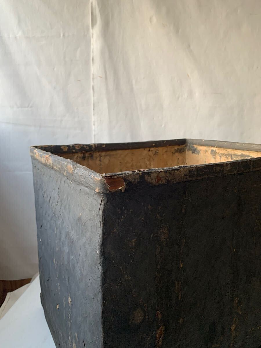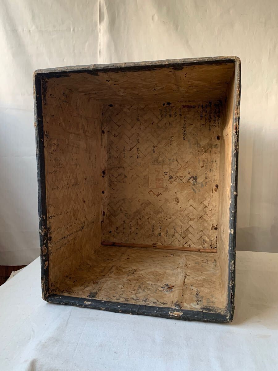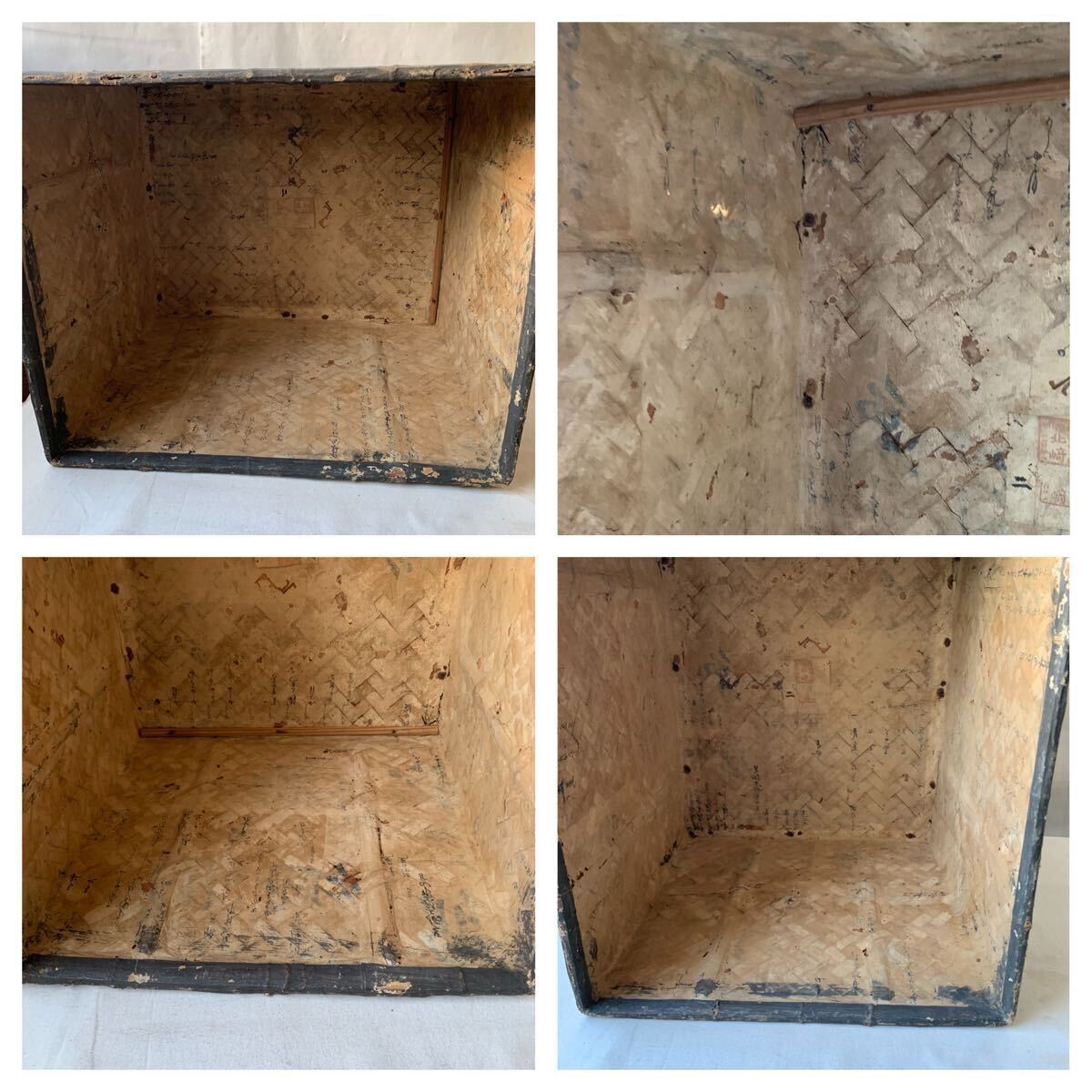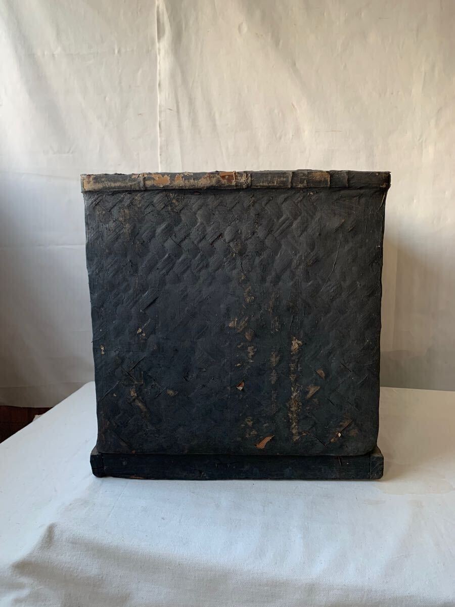 旧家蔵出し品 古い紙が貼られた竹籠です。経年の雰囲気が良く出ており、オブジェや花器などとして、お店のインテリアやお店のディスプレイ、イベント出店時の什器などに使って頂くと素敵だと思います。