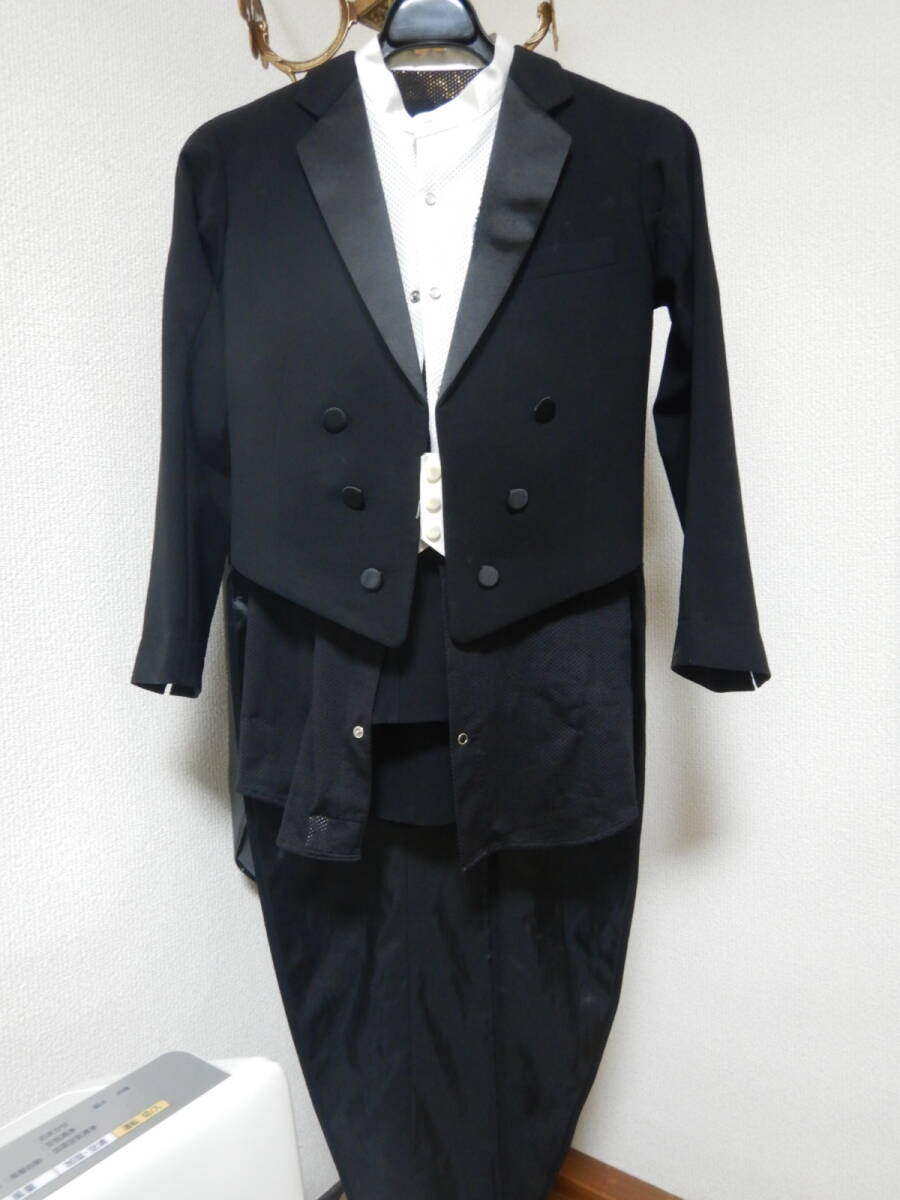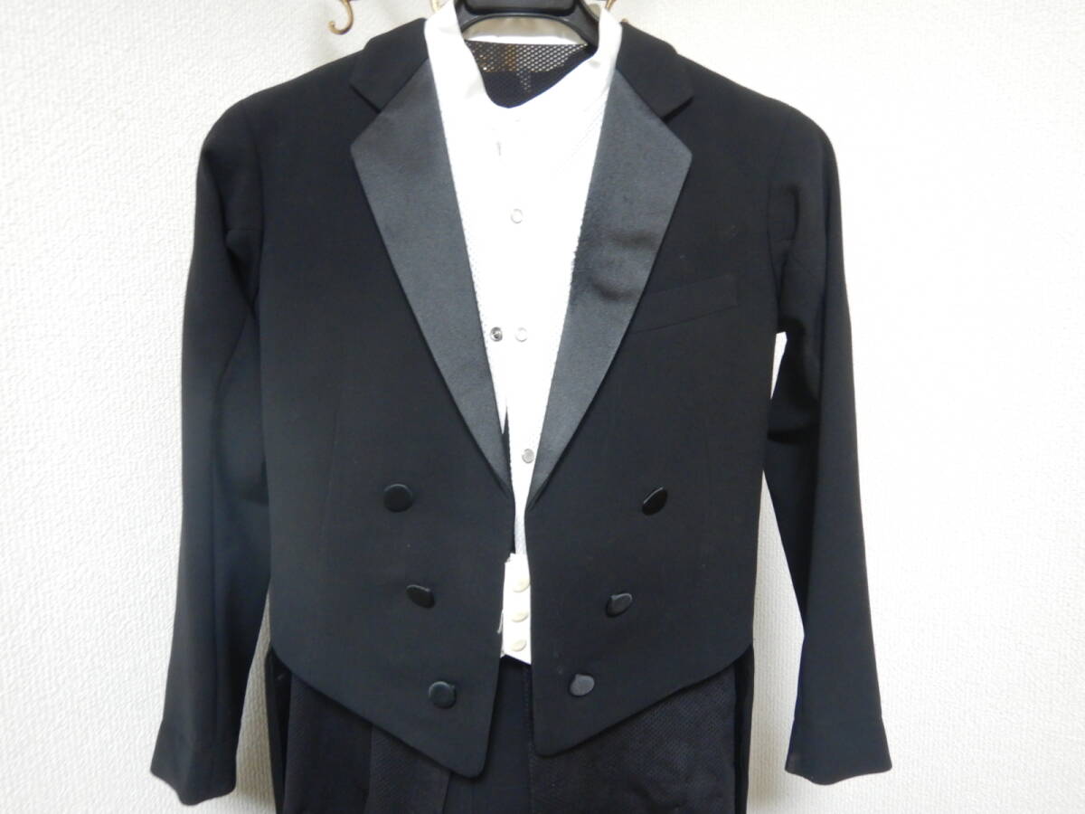 ハセベ製燕尾服 中古品。サイズは身長176cm、袖丈52.5cm、肩幅45cm、身幅44cm、股上40cmm股下78.5cm