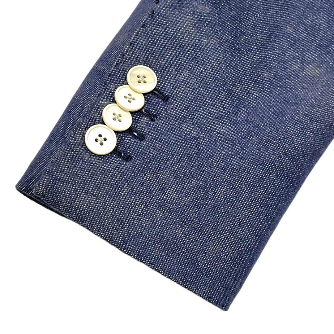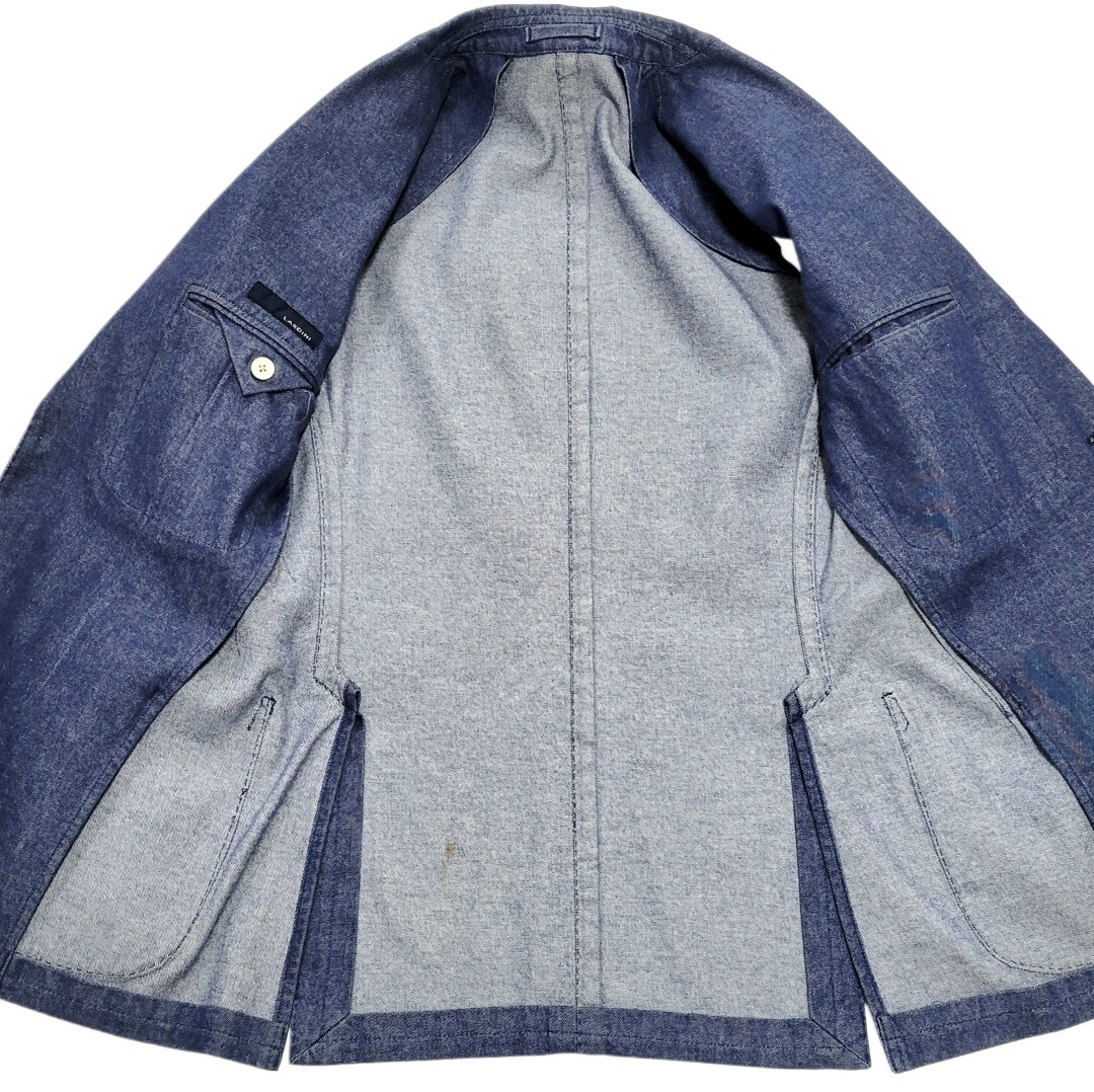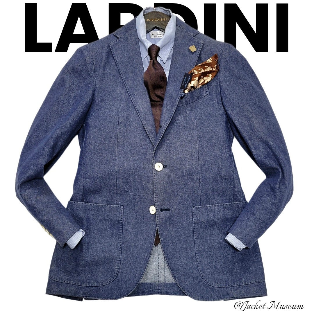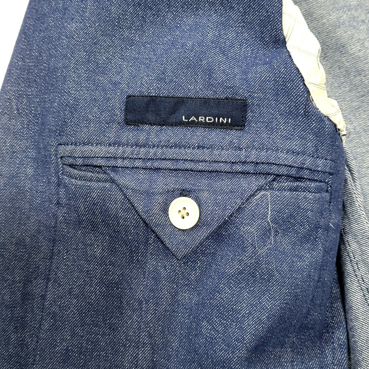 ラルディーニのデニムコットン、アンコン テーラードジャケットです。色はライトネイビー、ブラウンスラックスと合わせれば、イタリア的 アズーロエマローネ コーデが完成です。カジュアル、オフィス、着まわしがききます。大変お洒落です。超高級なイタリア製、美シルエット。15回程度利用、自宅保管品、美品に近い部類かと思います。