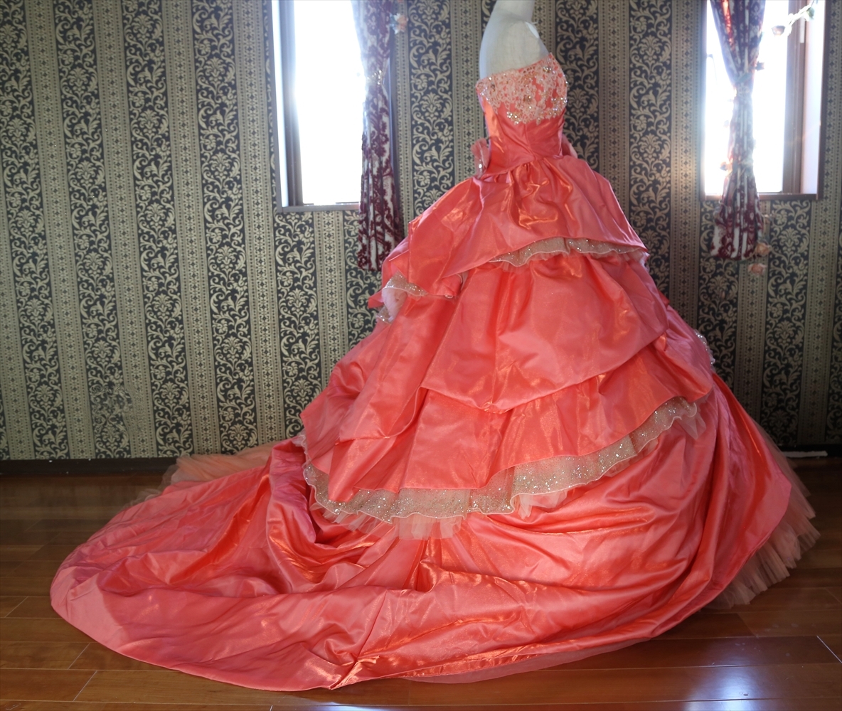 生地はサーモンオレンジのサテンをメインに、一部チュール生地、ゴールドのラメ、レースなど
