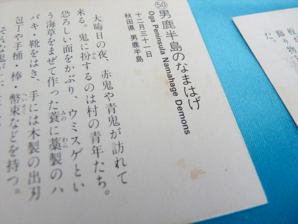 監修:倉林正次 写真:山田裕三 カード1枚サイズ:約93x64㎜ 箱サイズ:70x100x15㎜ 約90g 全50枚 ※素人採寸ですので、目安程度にお考えください。 有名無名を問わず日本全国のお祭りを50個ピックアップして収録。 何度か見た程度です。 全てのカードではありませんが、シミ・軽い汚れなどがあります。 カードの抜けなどはありません。 箱には、汚れやスレなど全体的な経年感があります。 鑑賞の妨げになるようなものではありません。 一部、画像にてご確認ください。 外観の印象等は当方の主観によるところですので、著しく違わない限りは ご理解いただけますと幸いです。 ※商品を見た限りでは把握しきれず、説明不足な場合もあります。 可能な限りお答えいたしますので、心配な点はご利用前にご質問ください。 ※落札決定後のキャンセル、返品は商品に明らかな問題がない限り お受けできません。 気になる方はお控えください。よろしくお願いいたします。 | ||||