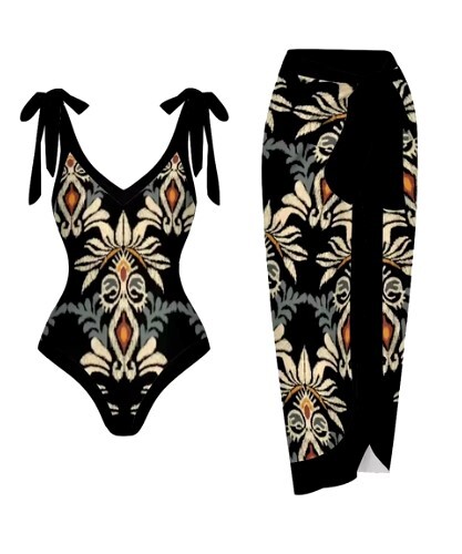 女性用水着、涼しげな花柄のスカート付きツーピース水着、ビーチウェア、色:ブラック