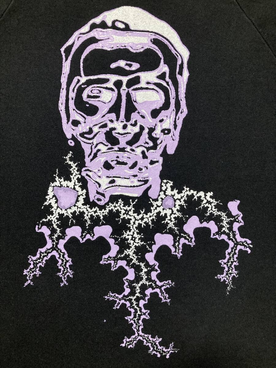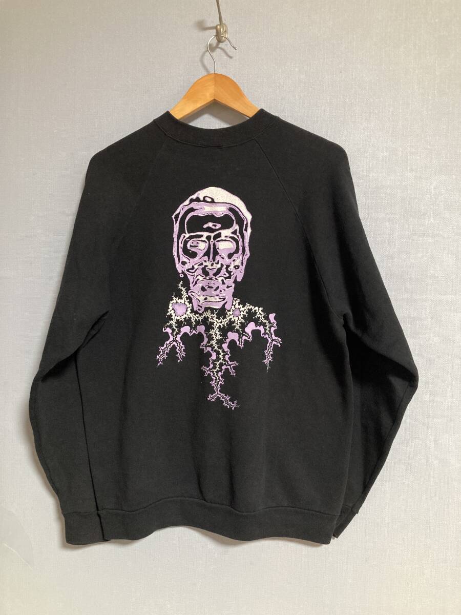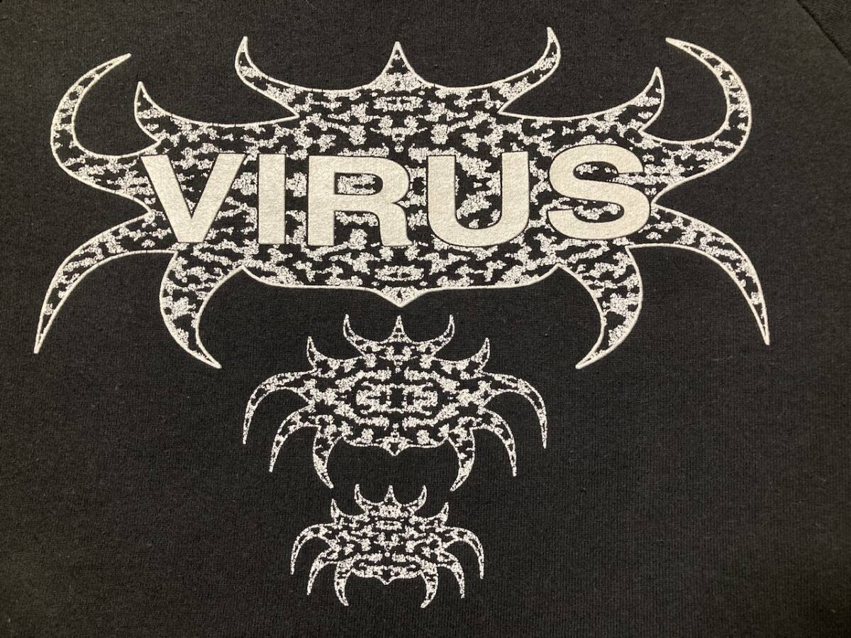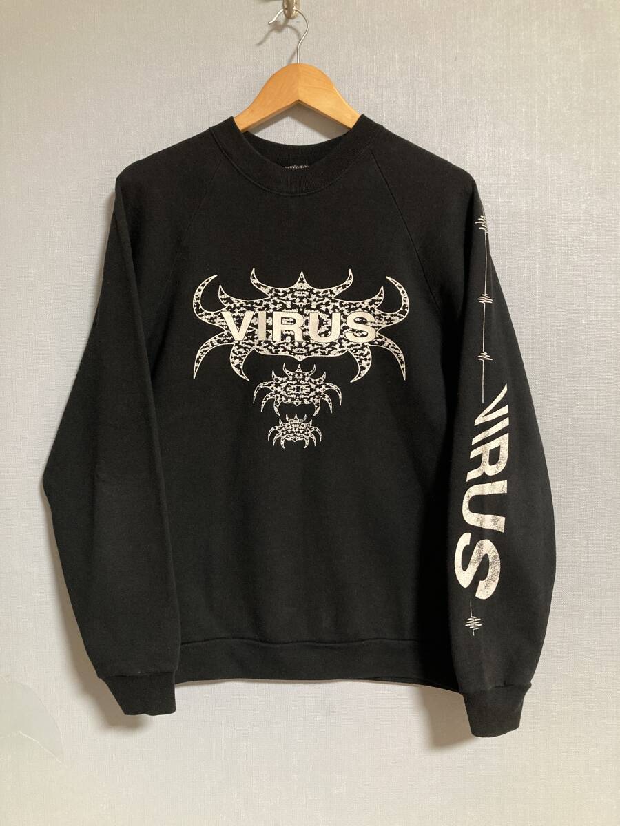 商品名:90s VIRUS スウェット サイズ:表記L 平置き肩幅(計測不可)cm 身幅(脇下~脇下)57cm 着丈(バック全長)70cm 裄丈88,5cm ※素人採寸の為多少の誤差はご了承下さい。 カラー:ブラック 状態:MADE IN IRELAND。コットン70%ポリエステル30%。左袖(プリントにスレあり)、バックプリント付き。右肩付近に小穴あり(画像10)。その他幾分かの使用感等ありますが目立ったダメージ無く雰囲気良いと思います。発送方法:レターパックプラス(配達記録付600円) ※古物になりますので神経質な方、御理解の無い方の御入札はお控え下さい。送料、振込手数料は落札者様の御負担となります。ノークレーム、ノーリターンでお願い致します。