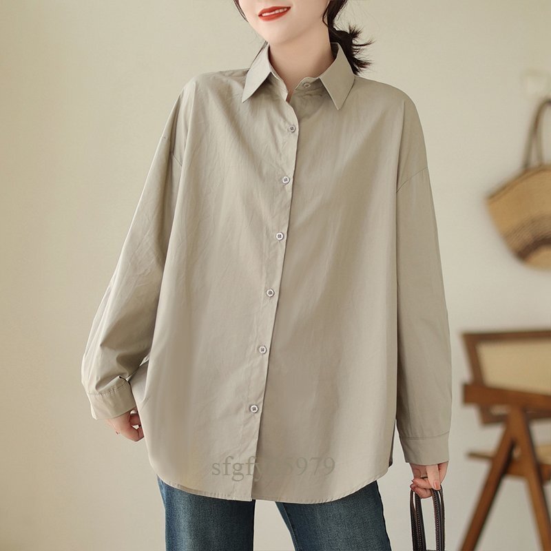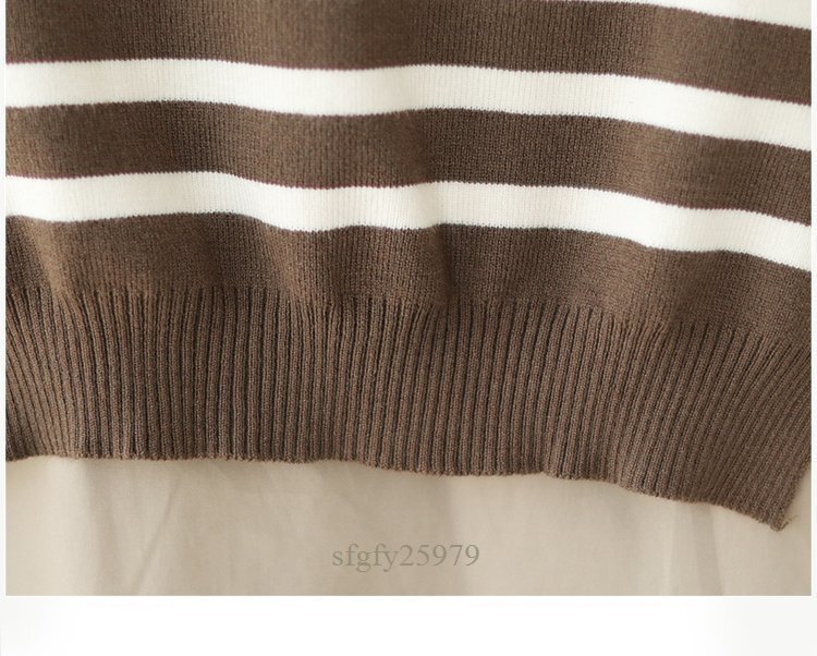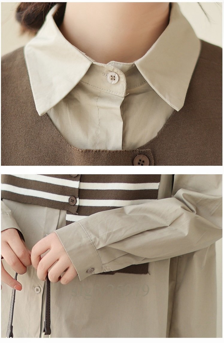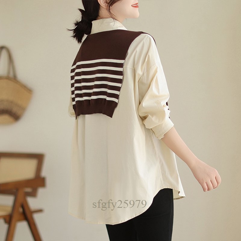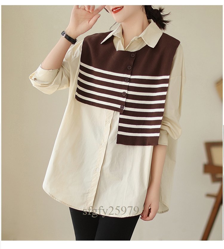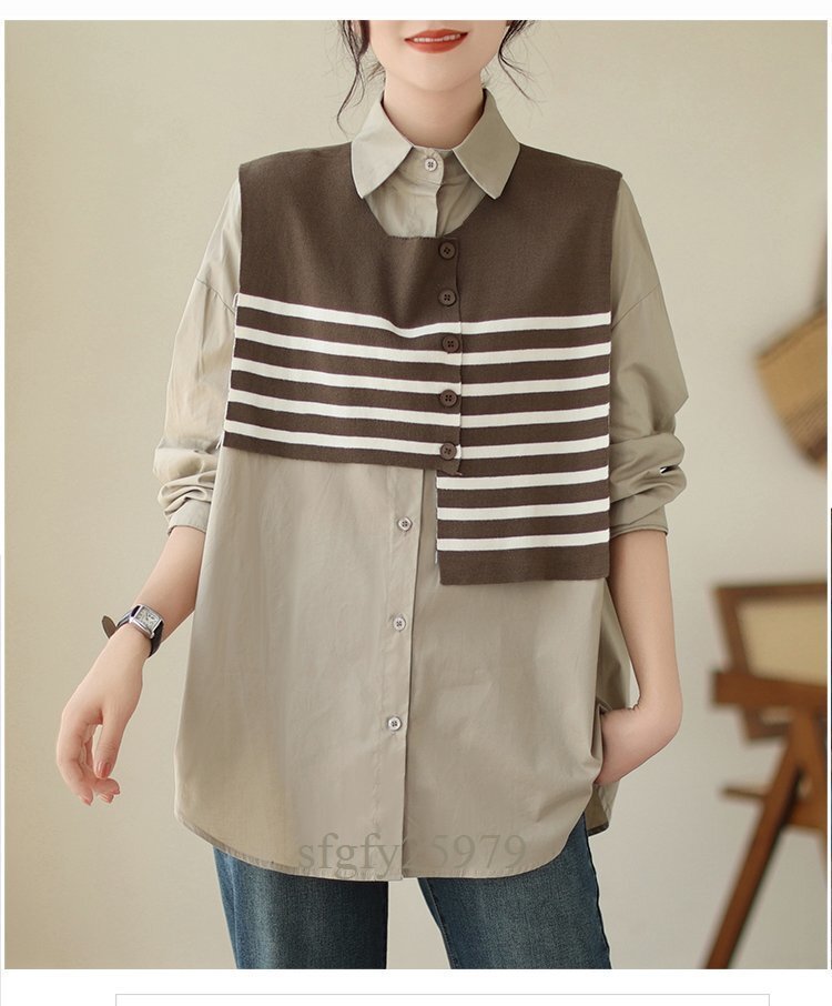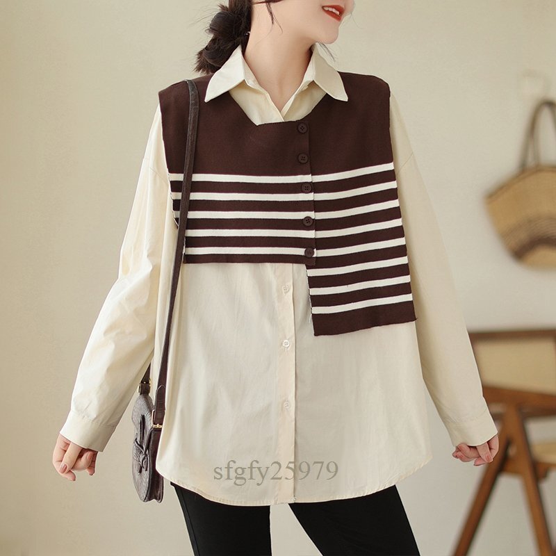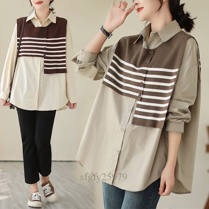 A5300☆新品秋カジュアル オシャレ ゆったり大きいサイズ 長袖 シャツブラウス+ ニット ボーダーベスト 2点セット カーキ