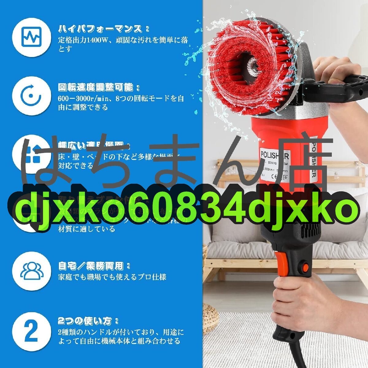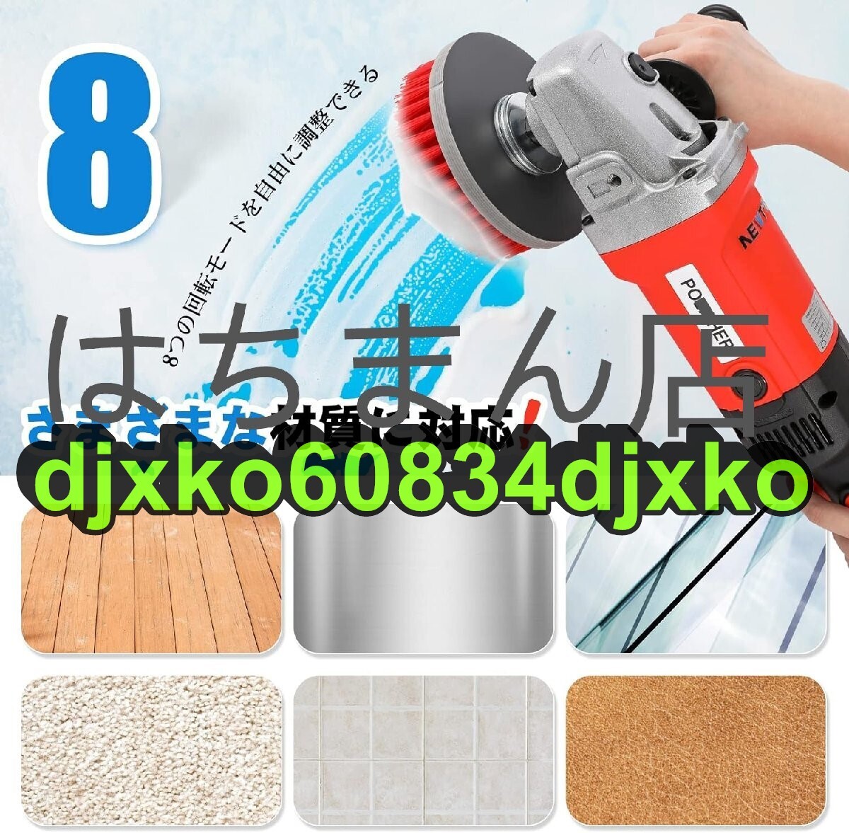 状態:新品未使用 【ハイパフォーマンス】電動お掃除ブラシは1400Wの定格出力で、一般的な電動お掃除ブラシに対し、本製品は高速な回転速度をもち、強力で汚れを簡単に取り除き、掃除時間と労力を大幅に短縮でき、効率的で便利のため、家庭の大掃除やクリーニング業者の作業に活躍しています。パワー不足の問題が解消できたため、掃除が楽な家事に変われます。 【8つの回転モード】600r/minから3000r/minまで、八つの回転速度を搭載します。材質や汚れ方に合わせてより自由に回転速度が選べます。傷つけないように優しく汚れを落とすか、或は頑固な汚れを強力かつ効果的に取り除くか、選ぶのはあなた次第です。 【プロ仕様の替えブラシ付き】用途に合わせて多種類のブラシが付いており、自由に付け替えてお使いいただけます。傷付きやすい布・革・木質製品から、硬質のステンレス・石造製品までのお掃除を楽にこなすことができます。そのためカーペットや床はもちろん、凸凹したタイルや錆取りにも適しています。また、ブラシには耐久性の高い素材を採用し、ハイクオリティでプロの業務作業にもおすすめします。 【操作が簡単】お掃除したい場所やものによって、ブラシを選び、回転速度を設定し、電源を入れてスイッチを押すとお掃除が始まります。本製品には跳ねの防止カバーが付いており、汚れた水が服にかからないよう、安心に家事を楽しめます。まさにお掃除に不可欠な味方です。 【セット内容】電動お掃除ブラシ本体*1、替えブラシ*6、跳ね防止カバー*1、スクレーパー*1、替えハンドル*2。どうぞご安心ください。万が一、何か不具合やご不明な点等がございましたらお気軽にご連絡ください。