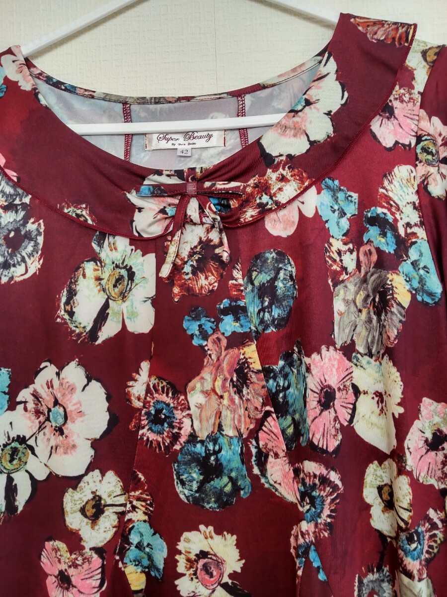 送料無料★美品★スーパービューティー★花柄リボンストレッチチュニック★42サイズ★ボルドー系★
