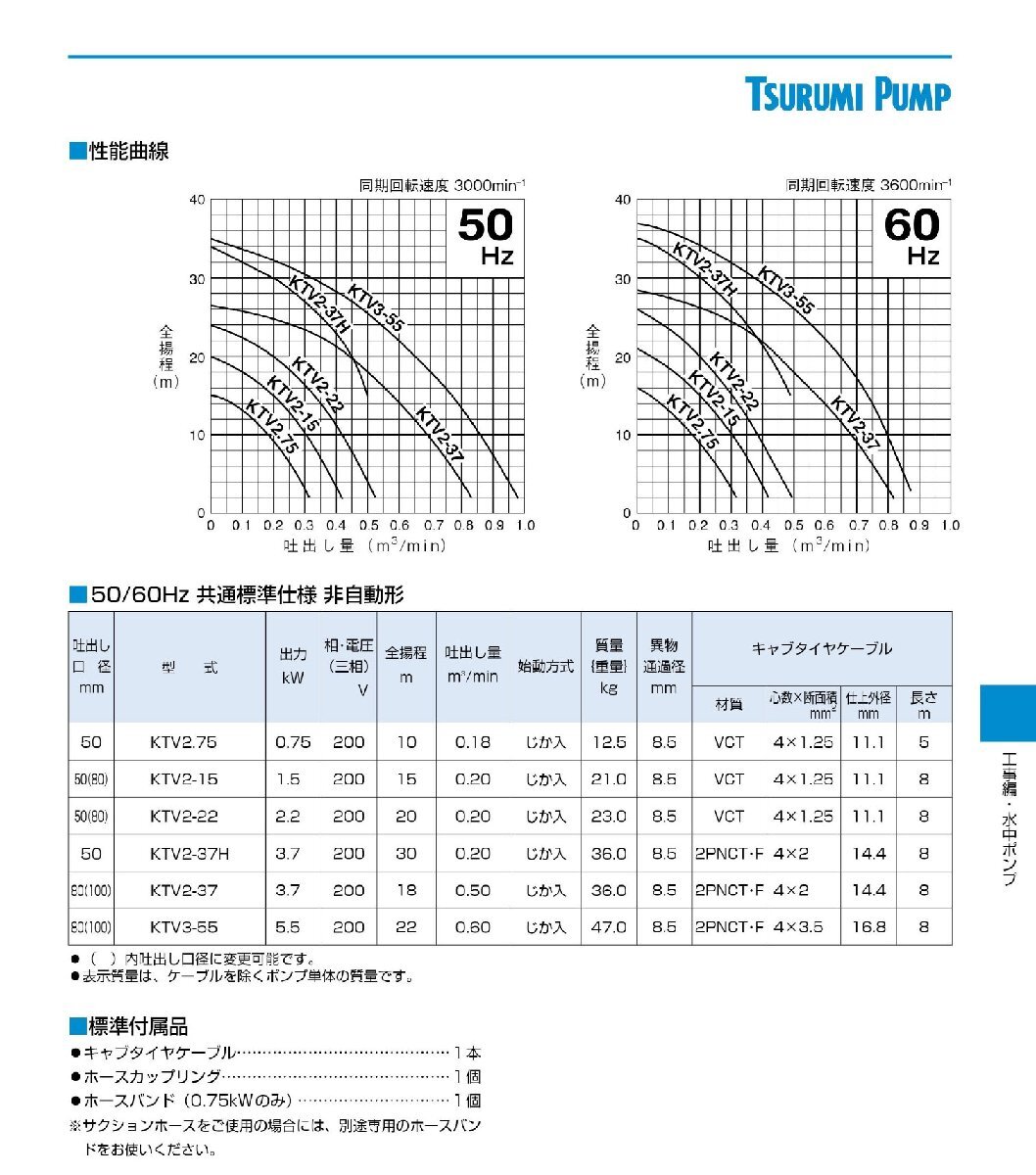 〈ツルミ〉KTV2-22 50Hz 東日本用 一般工事排水用 水中ハイスピンポンプ KTV型 非自動形 口径50mm 出力2.2kW ツルミポンプ 代引不可