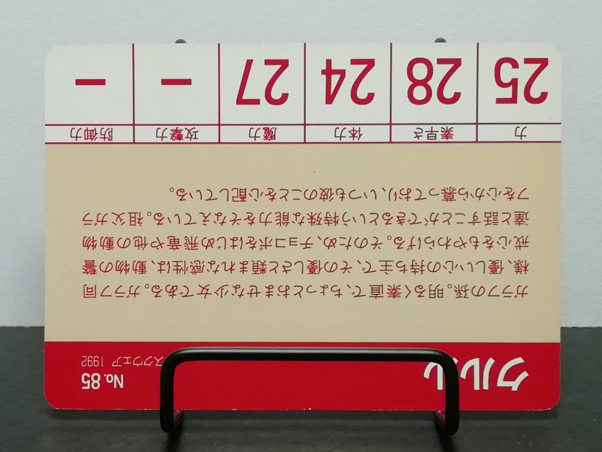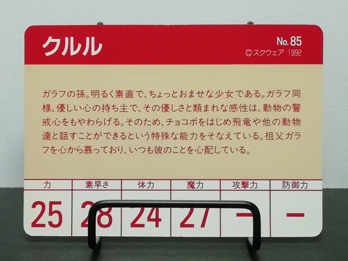 ※当方初出品の品で60枚を同時に出品しています。欠番埋めしたい方はこの機会にお買い求めください。※経年による変色が有ります。判別しやすい様、光度の調整は行っていません。 『ファイナルファンタジーⅤ』No.85 カードコレクション FINAL FANTASY Ⅴ ノーマルカード1枚です。FF5 1992年 当時もの SQUARESOFT■カードダスなど出品中です。●【商品状態】折れやハガレなどの目立つイタミはありません。画像をご確認ください。冷暗所に保管していましたが約30年前製造の紙製品のため印刷製造時の初期イタミ、微キズ、擦れ跡、経年変化(素材が原因の変色、曲がり)などが有ります。●キャンセル・返品はお受けできませんので状態質問などは「入札前」にしていただき、ご理解ご了承の上お買い求めください。■Ⅹ(twitter)にて情報発信を始めました。『カードダス出品者 ヤフオク』(standfile2023)でご覧ください。